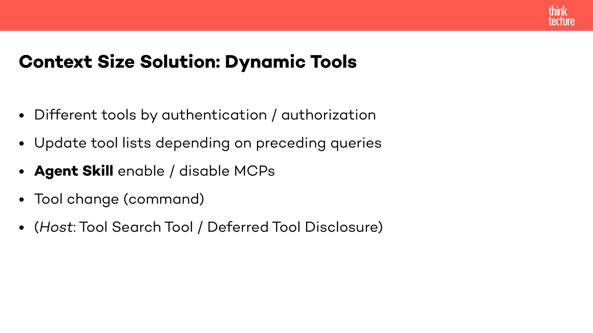lists depending on preceding queries • Agent Skill enable / disable MCPs • Tool change (command) • (Host: Tool Search Tool / Deferred Tool Disclosure) Context Size Solution: Dynamic Tools