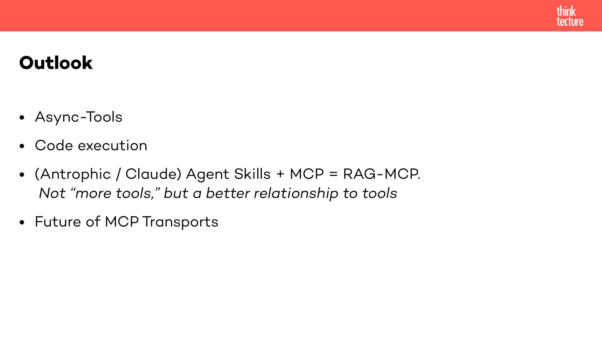 Skills + MCP = RAG-MCP. Not “more tools,” but a better relationship to tools • Future of MCP Transports Outlook