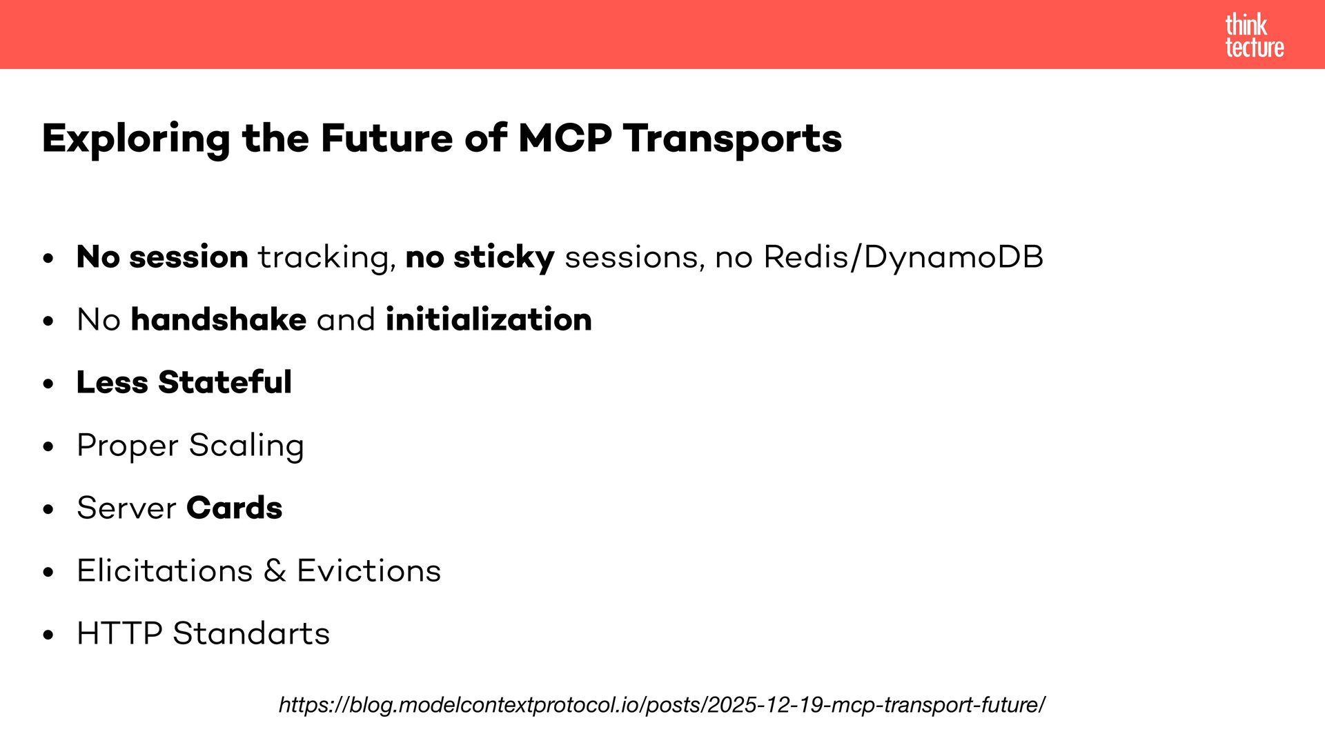No handshake and initialization • Less Stateful • Proper Scaling • Server Cards • Elicitations & Evictions • HTTP Standarts Exploring the Future of MCP Transports https://blog.modelcontextprotocol.io/posts/2025-12-19-mcp-transport-future/