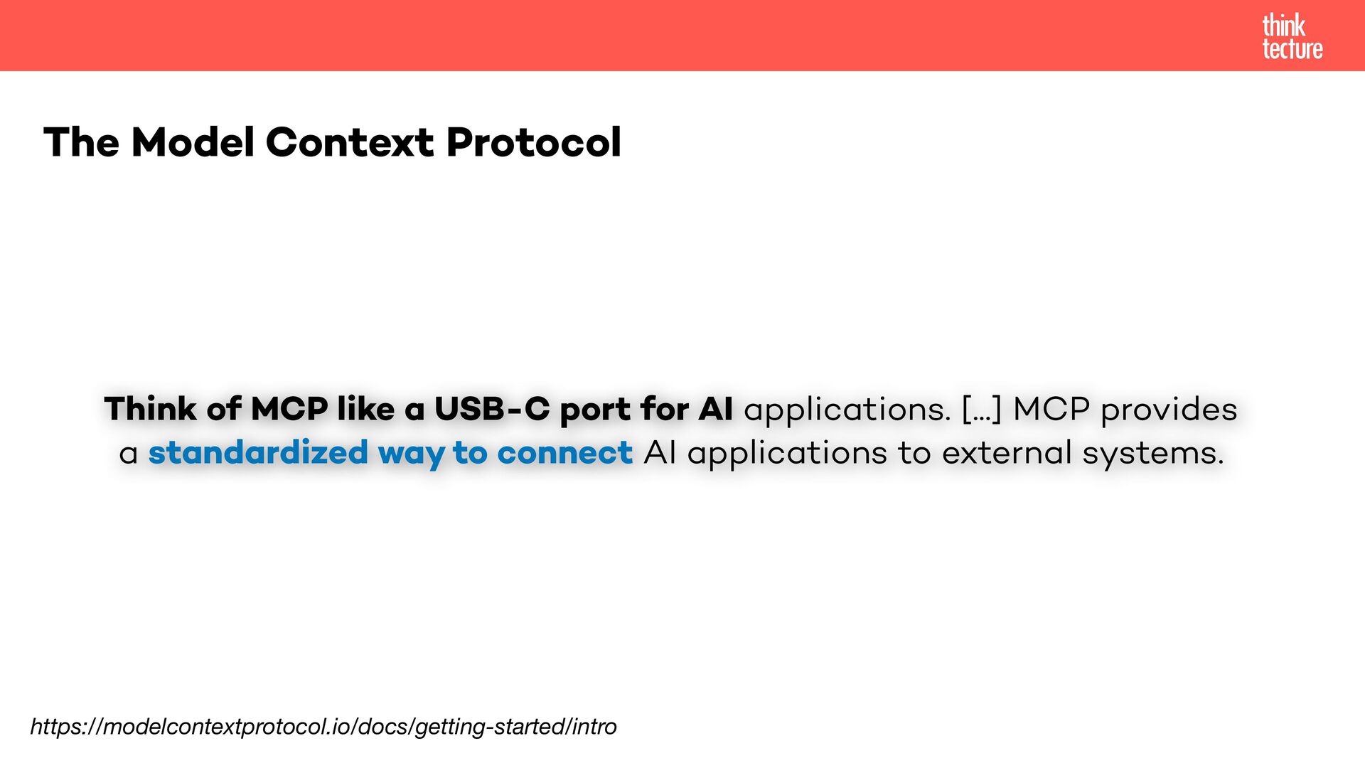 port for AI applications. [...] MCP provides a standardized way to connect AI applications to external systems. https://modelcontextprotocol.io/docs/getting-started/intro