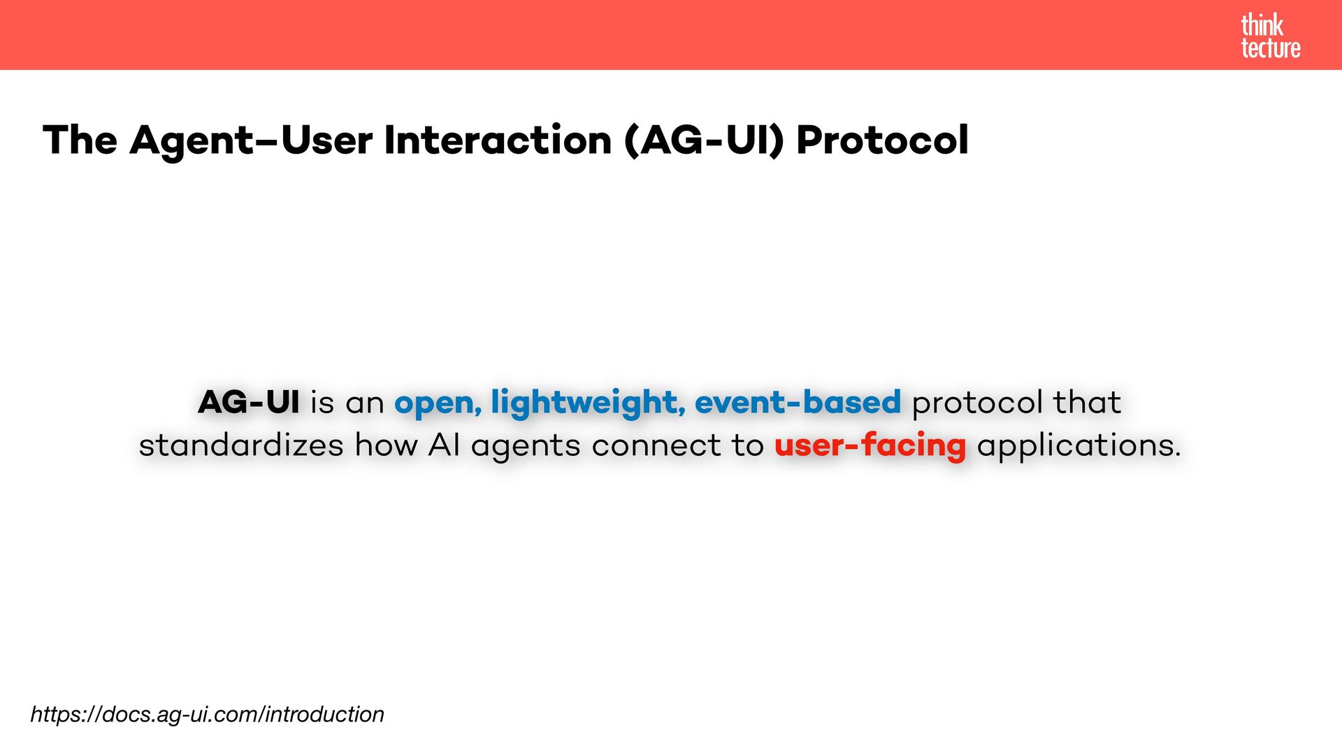 event-based protocol that standardizes how AI agents connect to user-facing applications. https://docs.ag-ui.com/introduction