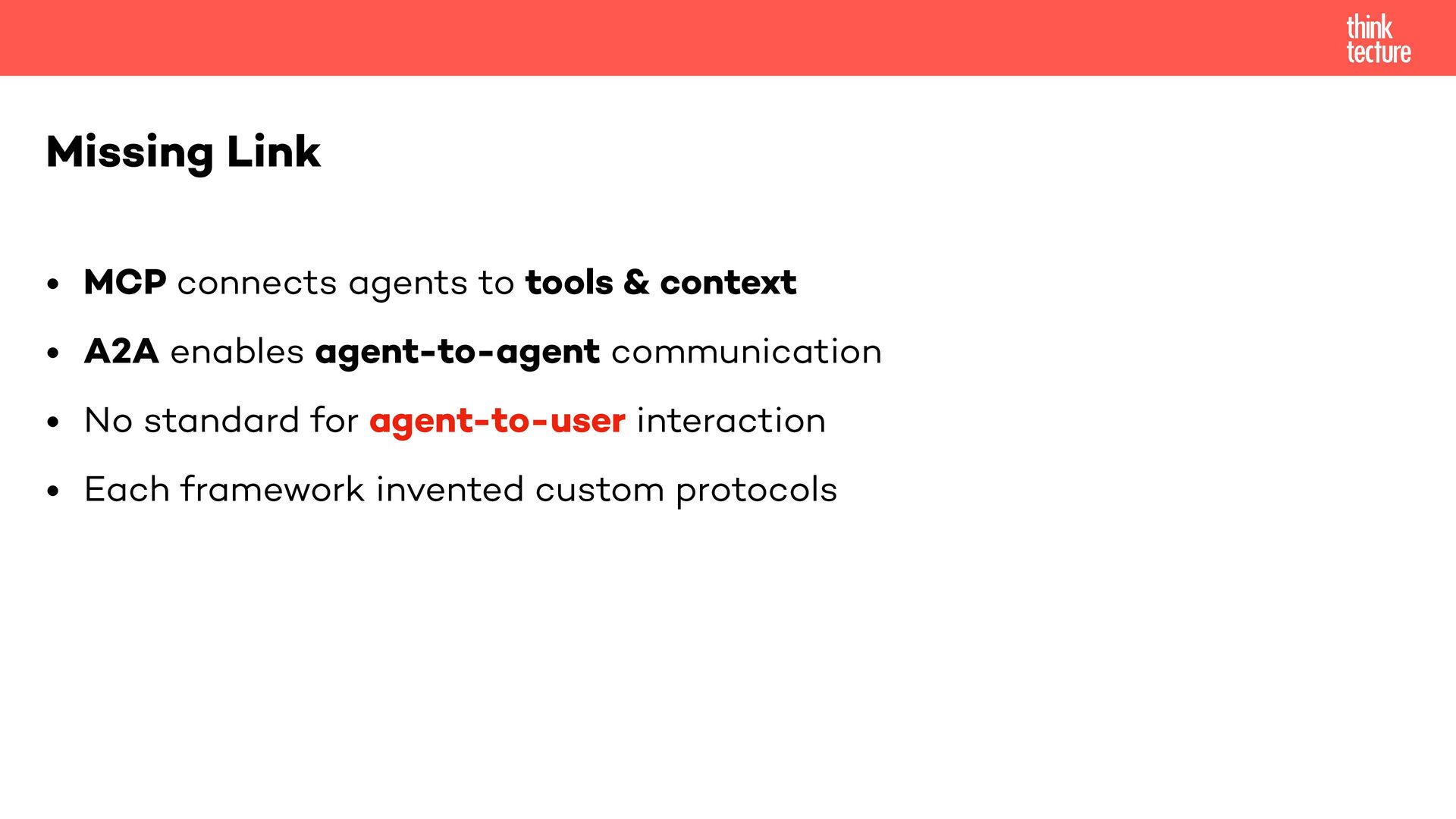 enables agent-to-agent communication • No standard for agent-to-user interaction • Each framework invented custom protocols Missing Link