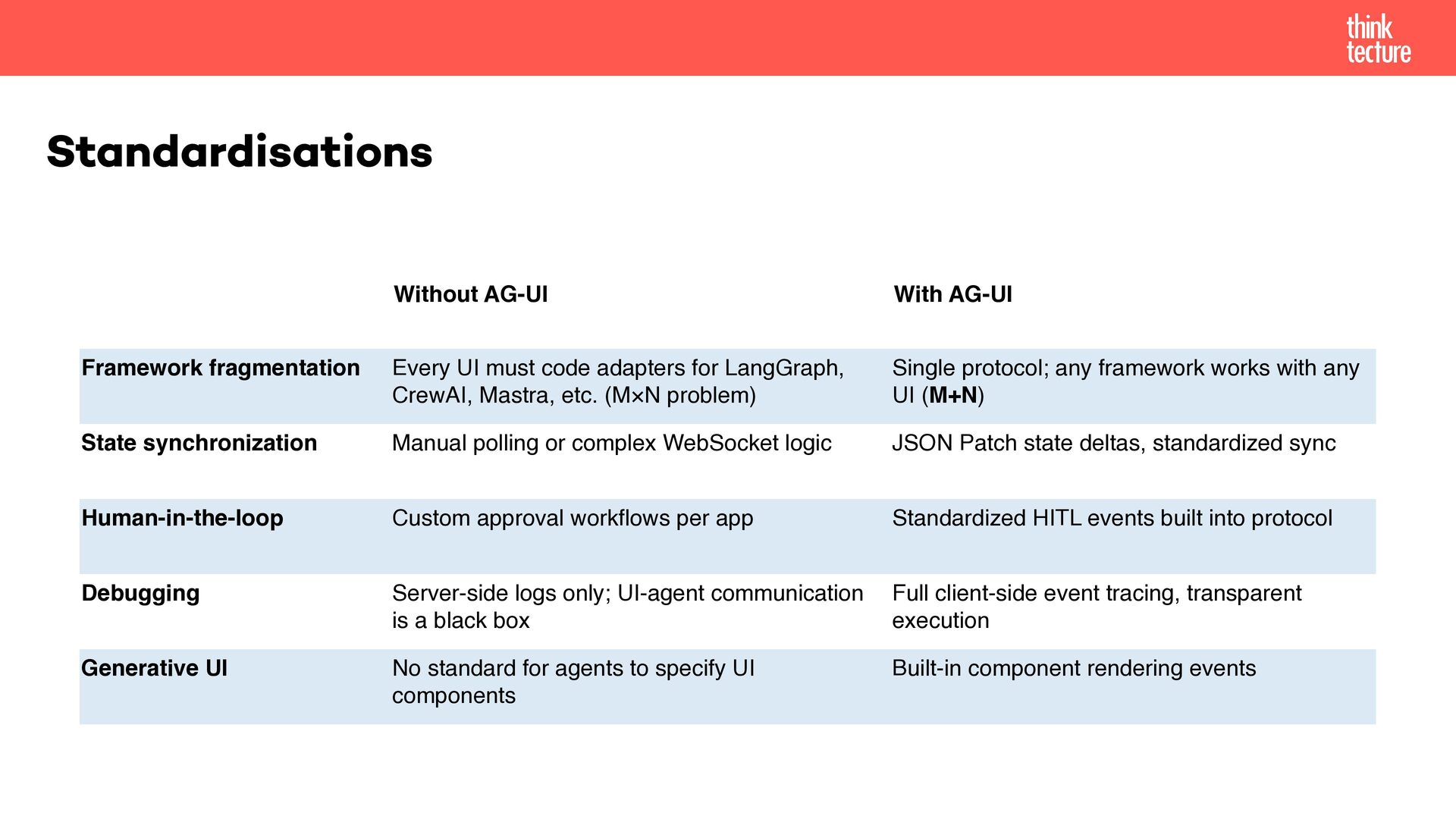 code adapters for LangGraph, CrewAI, Mastra, etc. (M×N problem) Single protocol; any framework works with any UI (M+N) State synchronization Manual polling or complex WebSocket logic JSON Patch state deltas, standardized sync Human-in-the-loop Custom approval workflows per app Standardized HITL events built into protocol Debugging Server-side logs only; UI-agent communication is a black box Full client-side event tracing, transparent execution Generative UI No standard for agents to specify UI components Built-in component rendering events
