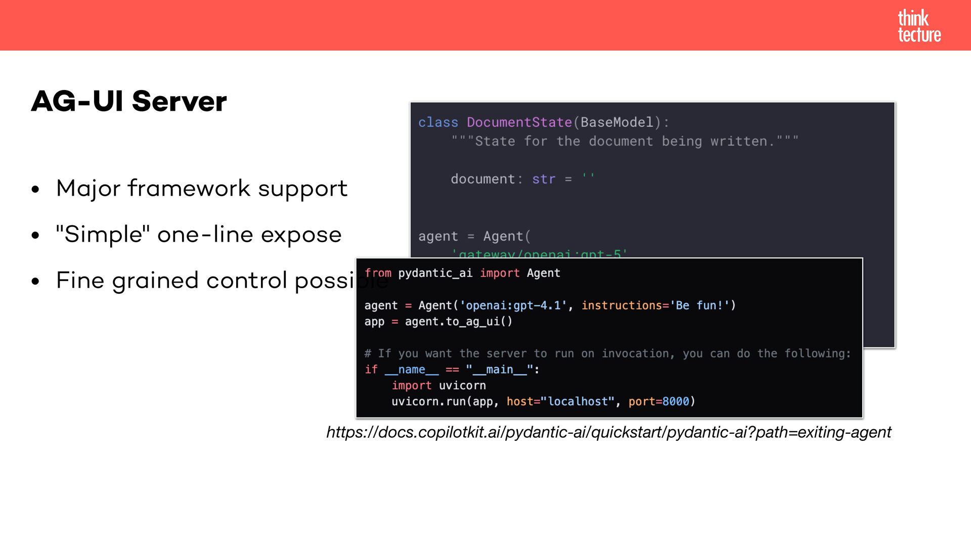 Human in the loop (HITL) • Use ready react components AG-UI Client https://docs.copilotkit.ai/pydantic-ai/quickstart/pydantic-ai?path=exiting-agent