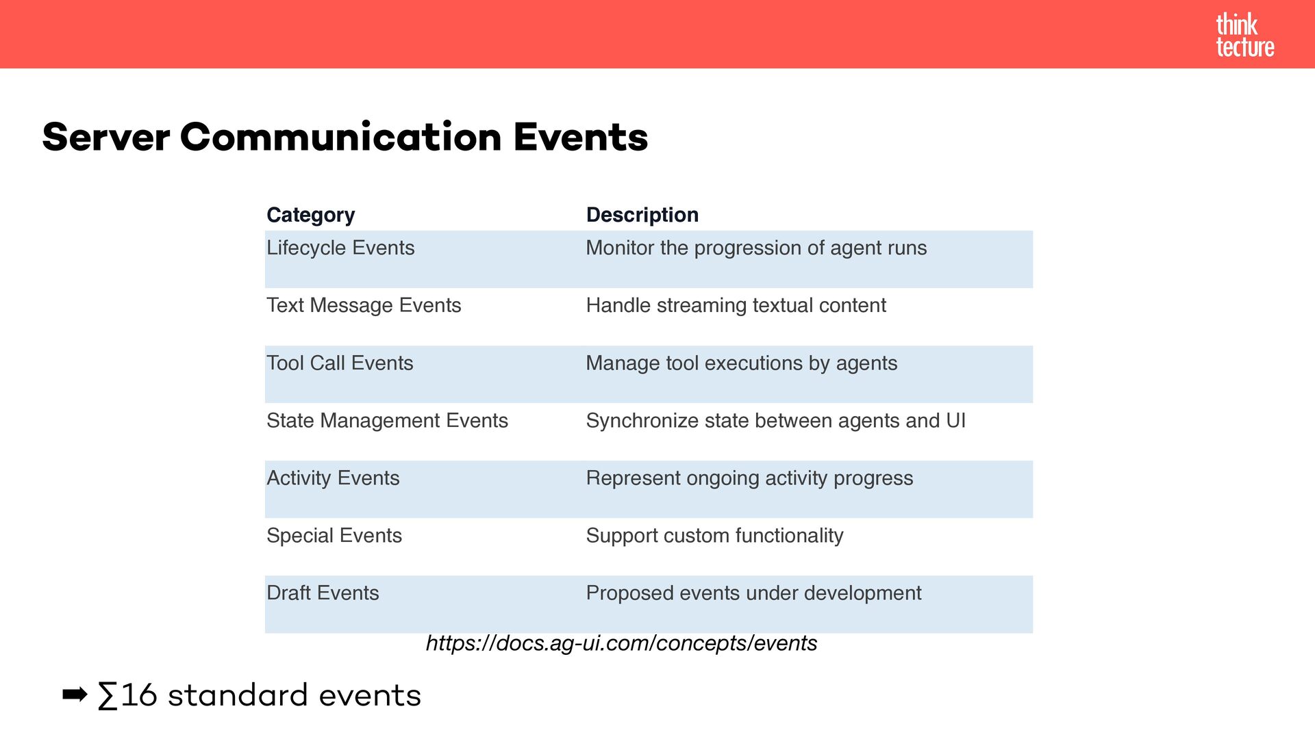 of agent runs Text Message Events Handle streaming textual content Tool Call Events Manage tool executions by agents State Management Events Synchronize state between agents and UI Activity Events Represent ongoing activity progress Special Events Support custom functionality Draft Events Proposed events under development https://docs.ag-ui.com/concepts/events ➡ ∑16 standard events
