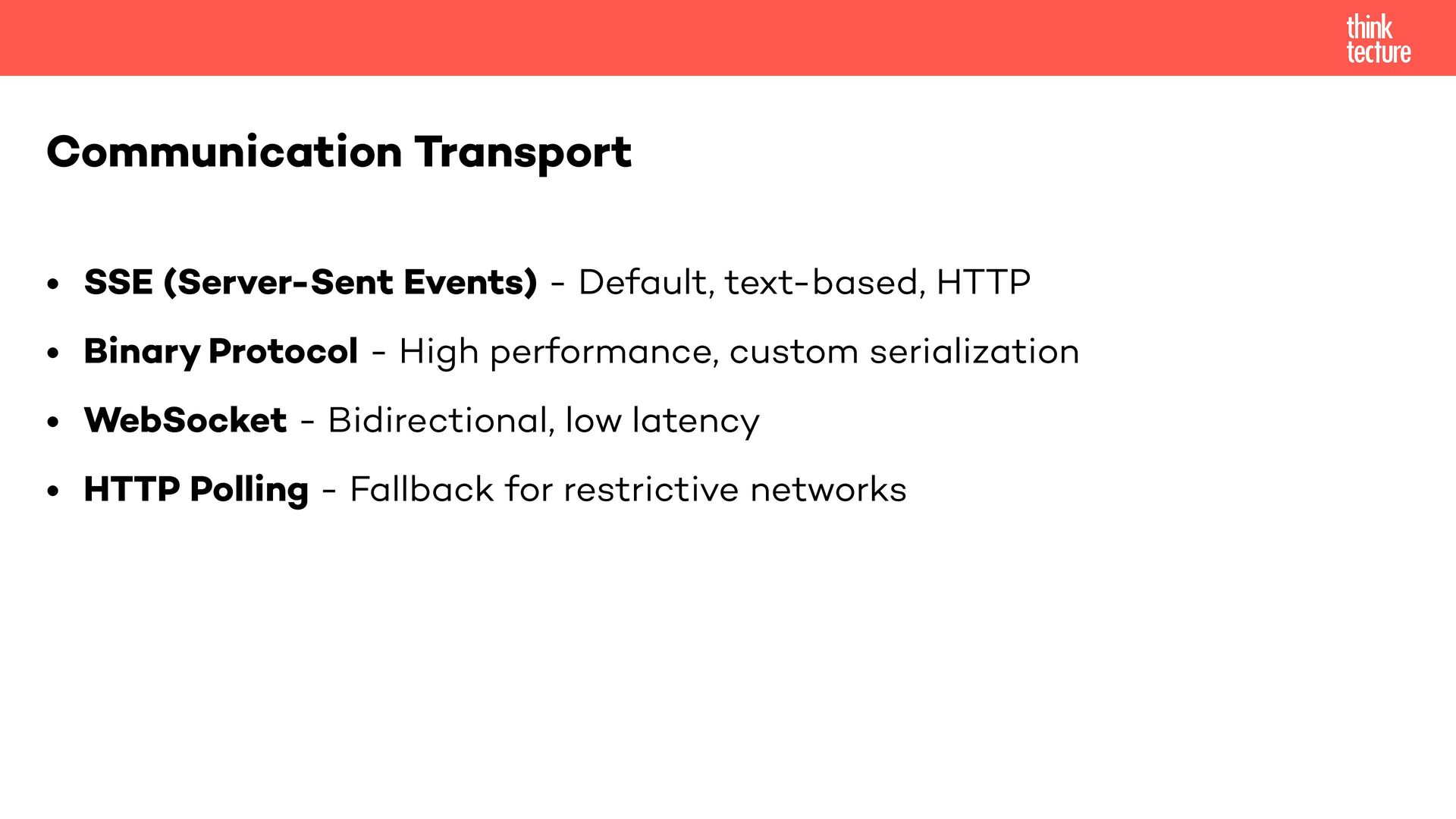 Protocol - High performance, custom serialization • WebSocket - Bidirectional, low latency • HTTP Polling - Fallback for restrictive networks Communication Transport