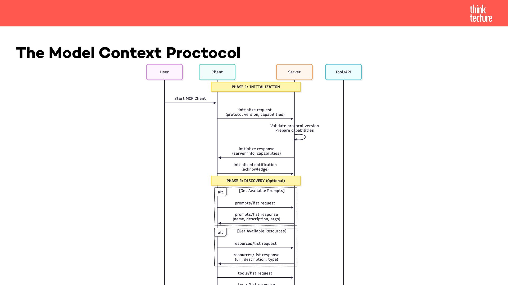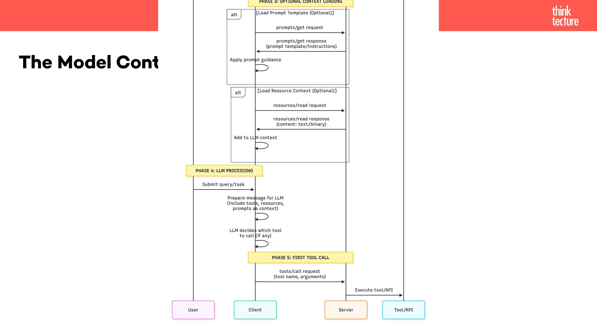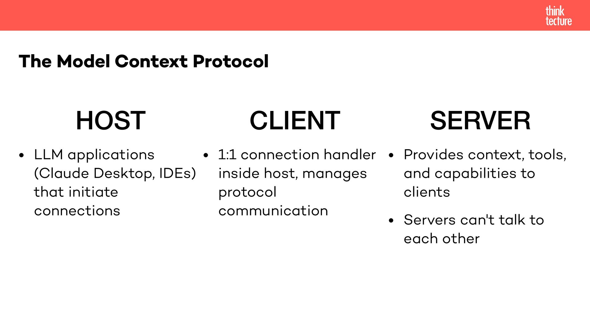 The Model Context Protocol CLIENT • 1:1 connection handler inside host, manages protocol communication SERVER • Provides context, tools, and capabilities to clients • Servers can't talk to each other