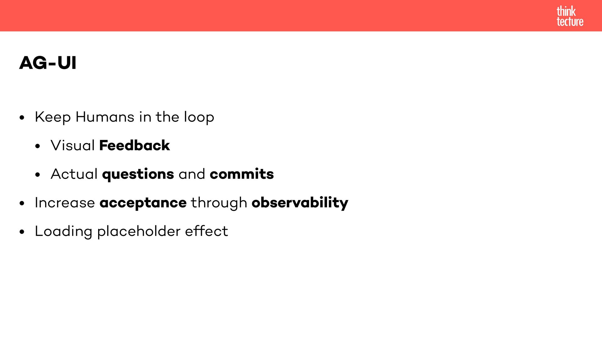 Actual questions and commits • Increase acceptance through observability • Loading placeholder effect AG-UI