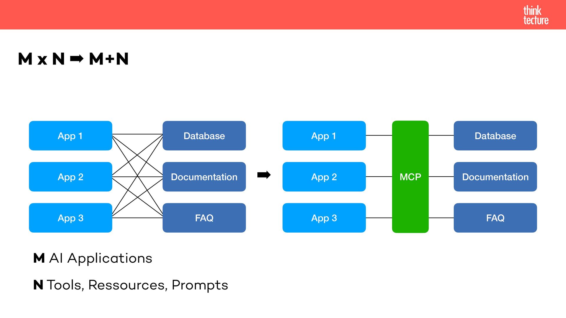 2 Database Documentation FAQ App 1 App 3 App 2 Database Documentation FAQ MCP M AI Applications N Tools, Ressources, Prompts ➡