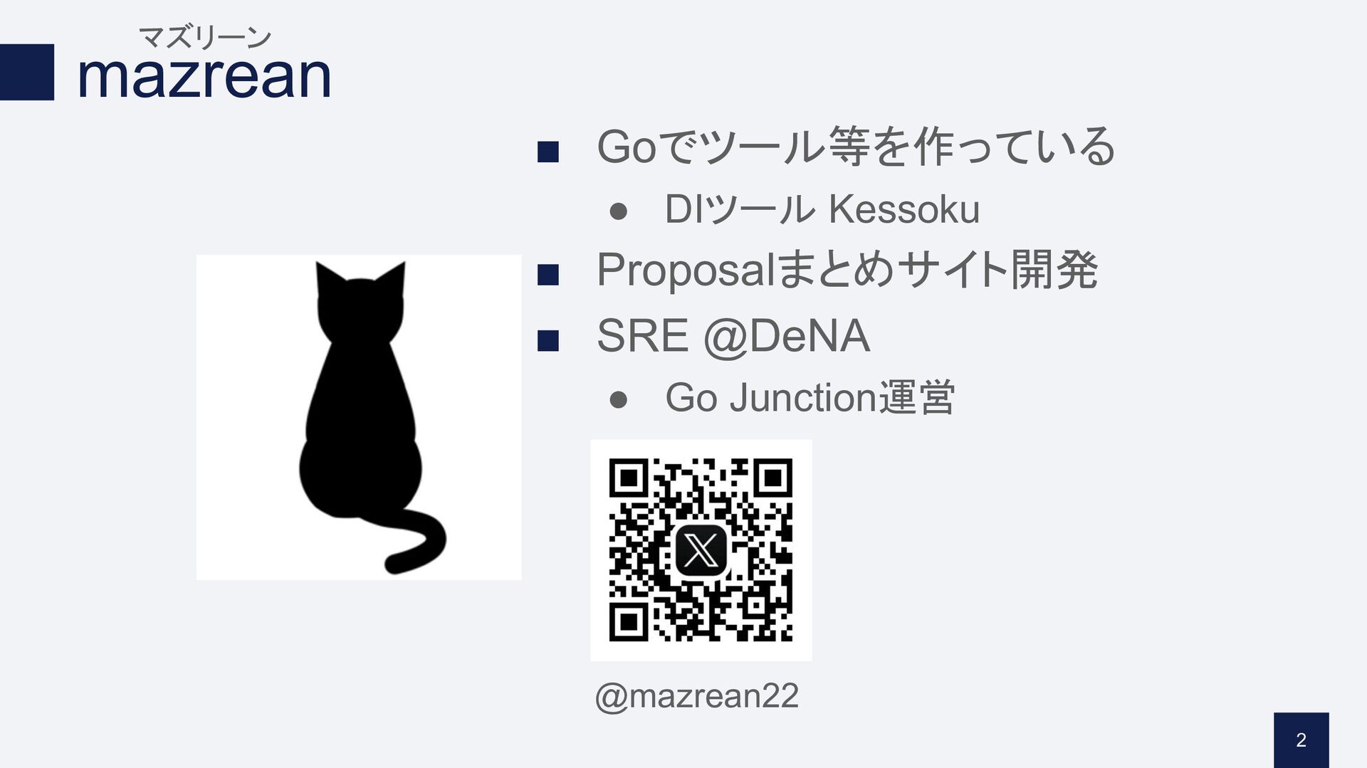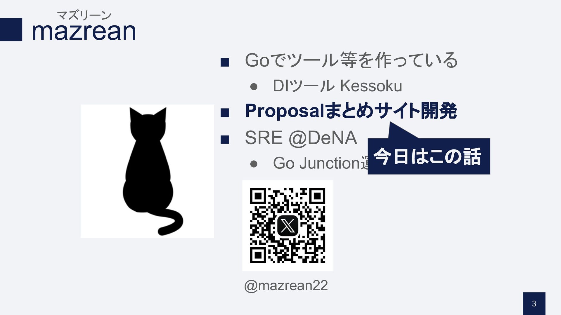 mazrean ▪ Goでツール等を作っている • DIツール Kessoku ▪ Proposalまとめサイト開発 ▪ SRE