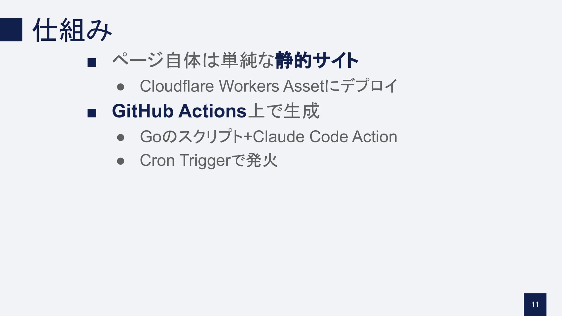 仕組み ▪ ページ自体は単純な静的サイト • Cloudflare Workers Assetにデプロイ ▪ GitHub Actions上で生成