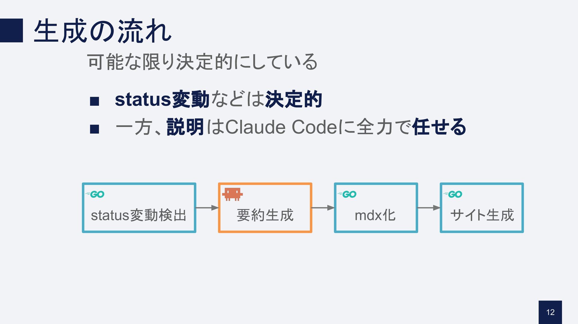 生成の流れ 可能な限り決定的にしている ▪ status変動などは決定的 ▪ 一方、説明はClaude Codeに全力で任せる 12 status変動検出 要約生成