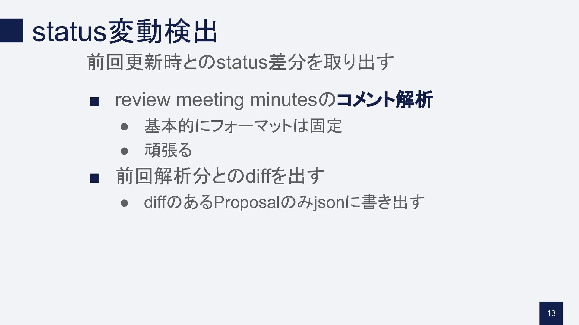 status変動検出 前回更新時とのstatus差分を取り出す ▪ review meeting minutesのコメント解析 • 基本的にフォーマットは固定 • 頑張る