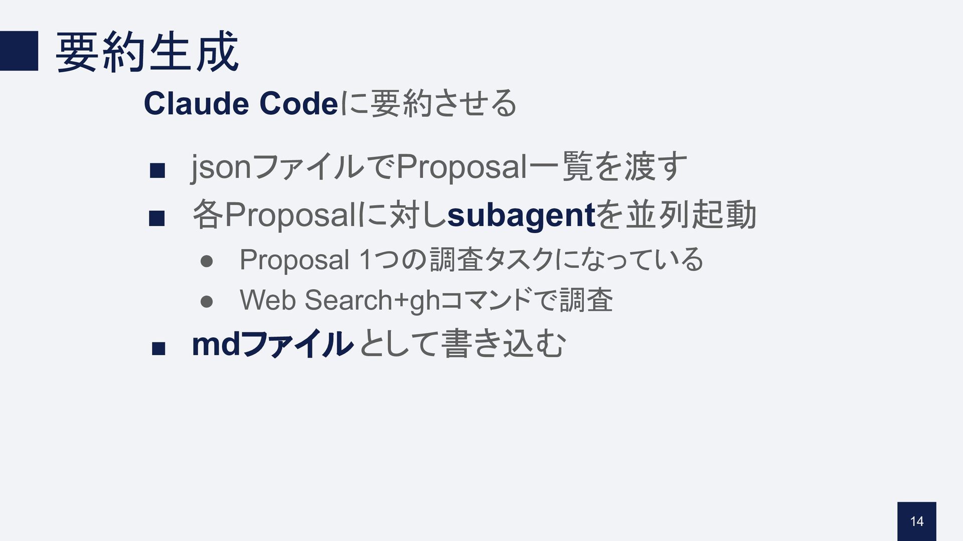 要約生成 Claude Codeに要約させる ▪ jsonファイルでProposal一覧を渡す ▪ 各Proposalに対しsubagentを並列起動 • Proposal 1つの調査タスクになっている