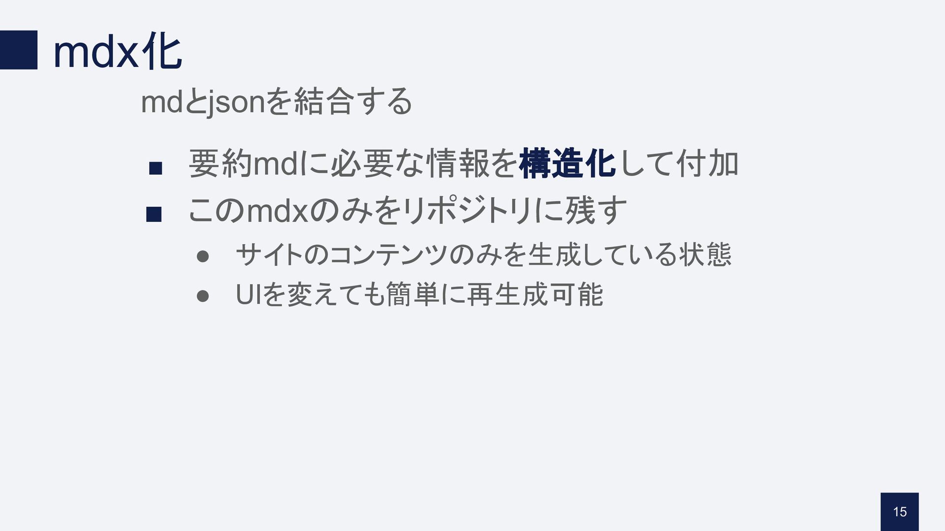mdx化 mdとjsonを結合する ▪ 要約mdに必要な情報を構造化して付加 ▪ このmdxのみをリポジトリに残す • サイトのコンテンツのみを生成している状態 • UIを変えても簡単に再生成可能