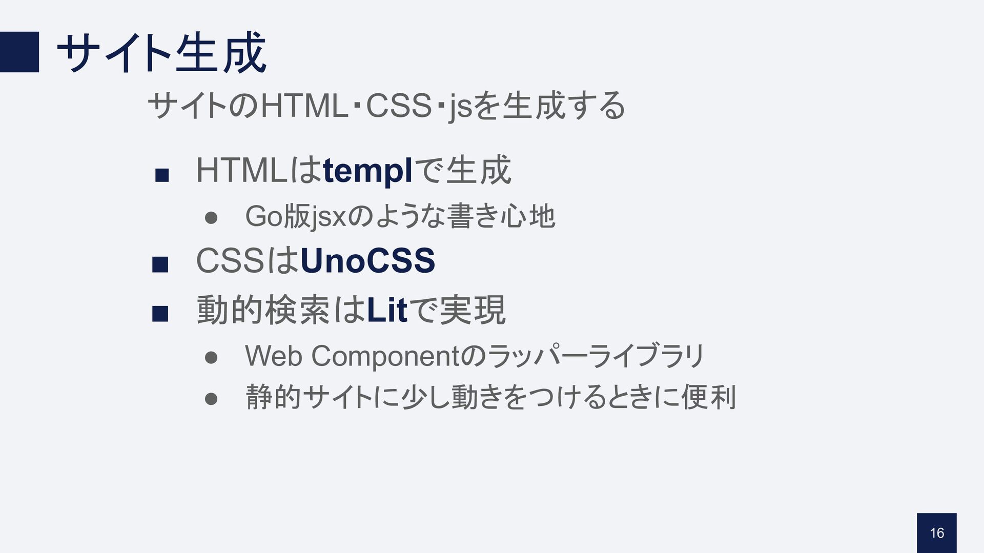 サイト生成 サイトのHTML・CSS・jsを生成する ▪ HTMLはtemplで生成 • Go版jsxのような書き心地 ▪ CSSはUnoCSS ▪ 動的検索はLitで実現