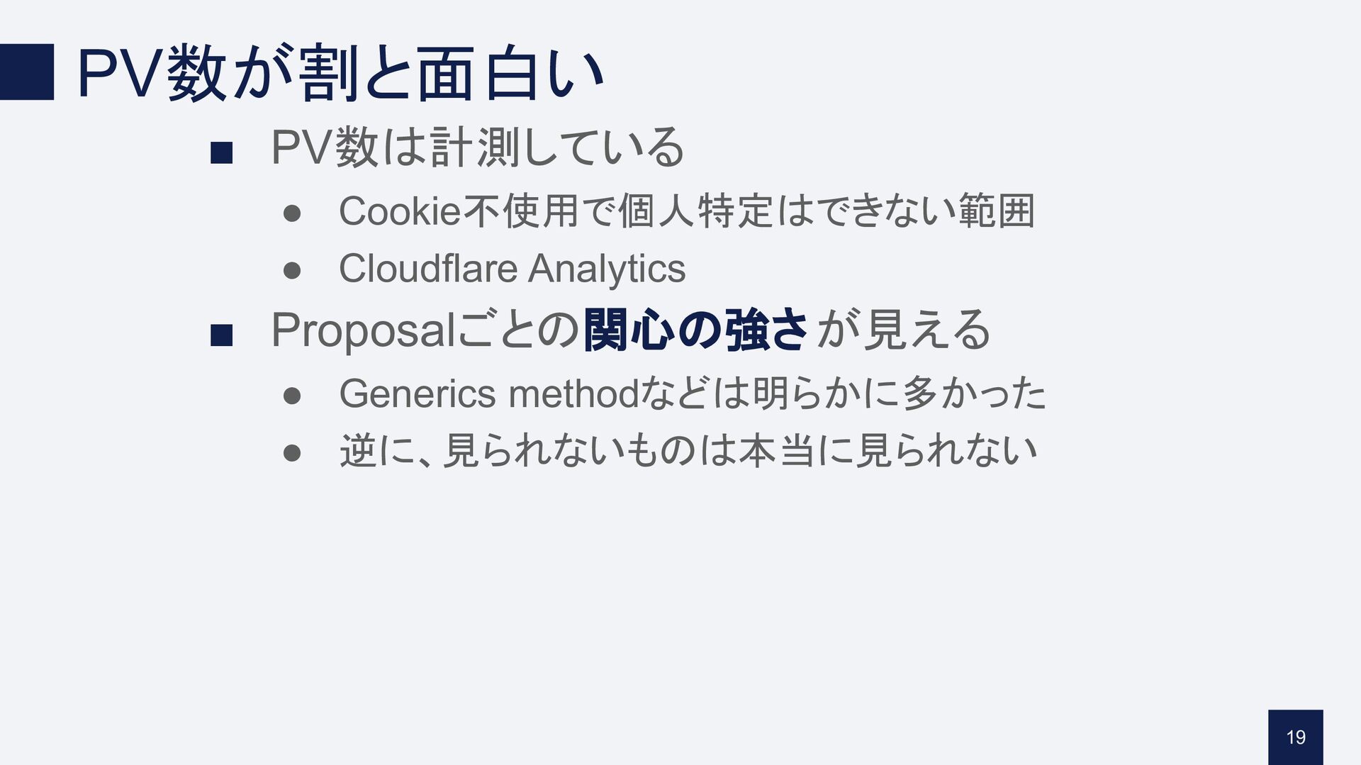 PV数が割と面白い ▪ PV数は計測している • Cookie不使用で個人特定はできない範囲 • Cloudflare Analytics ▪ Proposalごとの関心の強さ