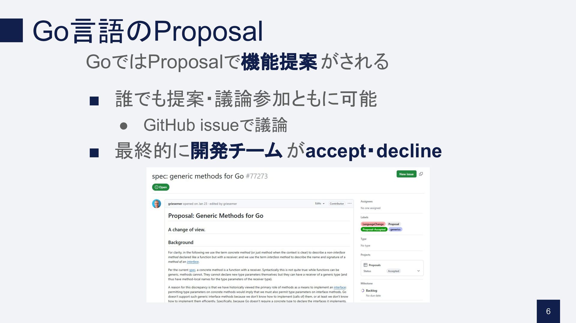 Go言語のProposal GoではProposalで機能提案がされる ▪ 誰でも提案・議論参加ともに可能 • GitHub issueで議論 ▪ 最終的に開発チーム がaccept・decline