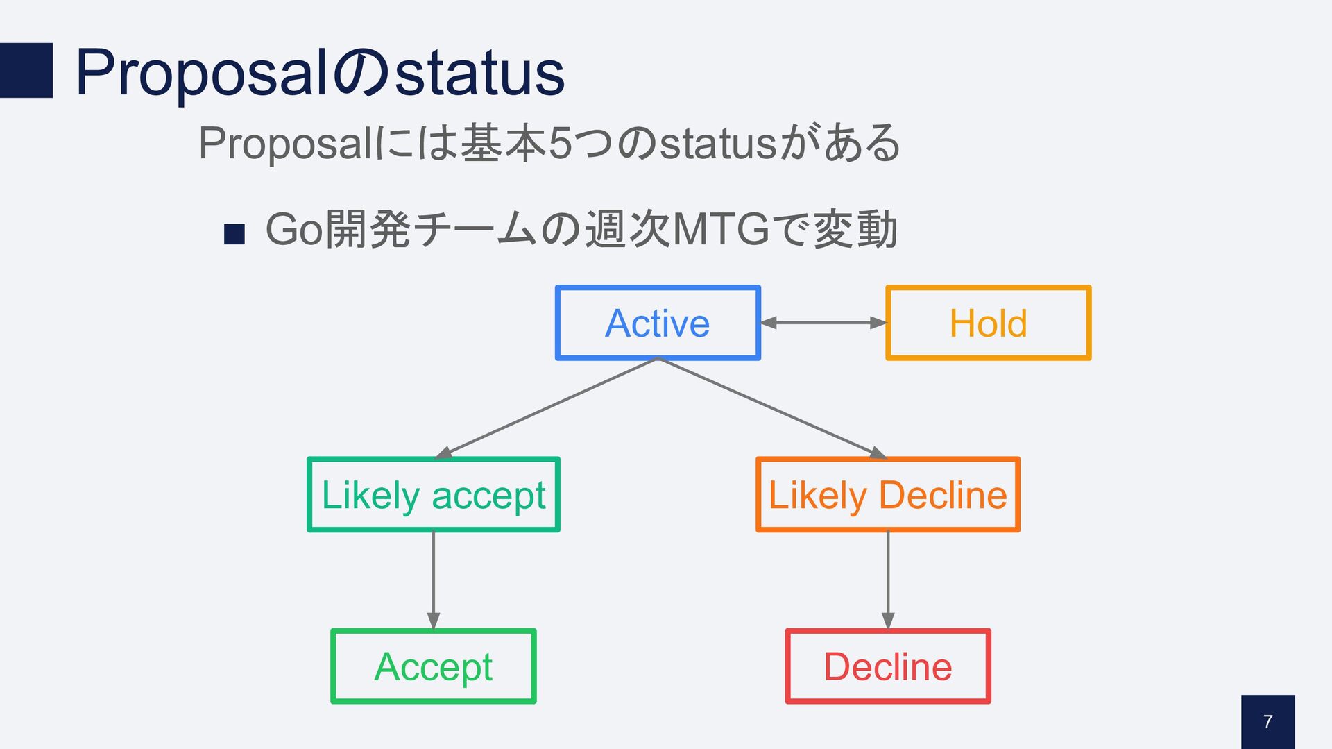 Proposalのstatus Proposalには基本5つのstatusがある ▪ Go開発チームの週次MTGで変動 7 Active Hold Likely accept Likely