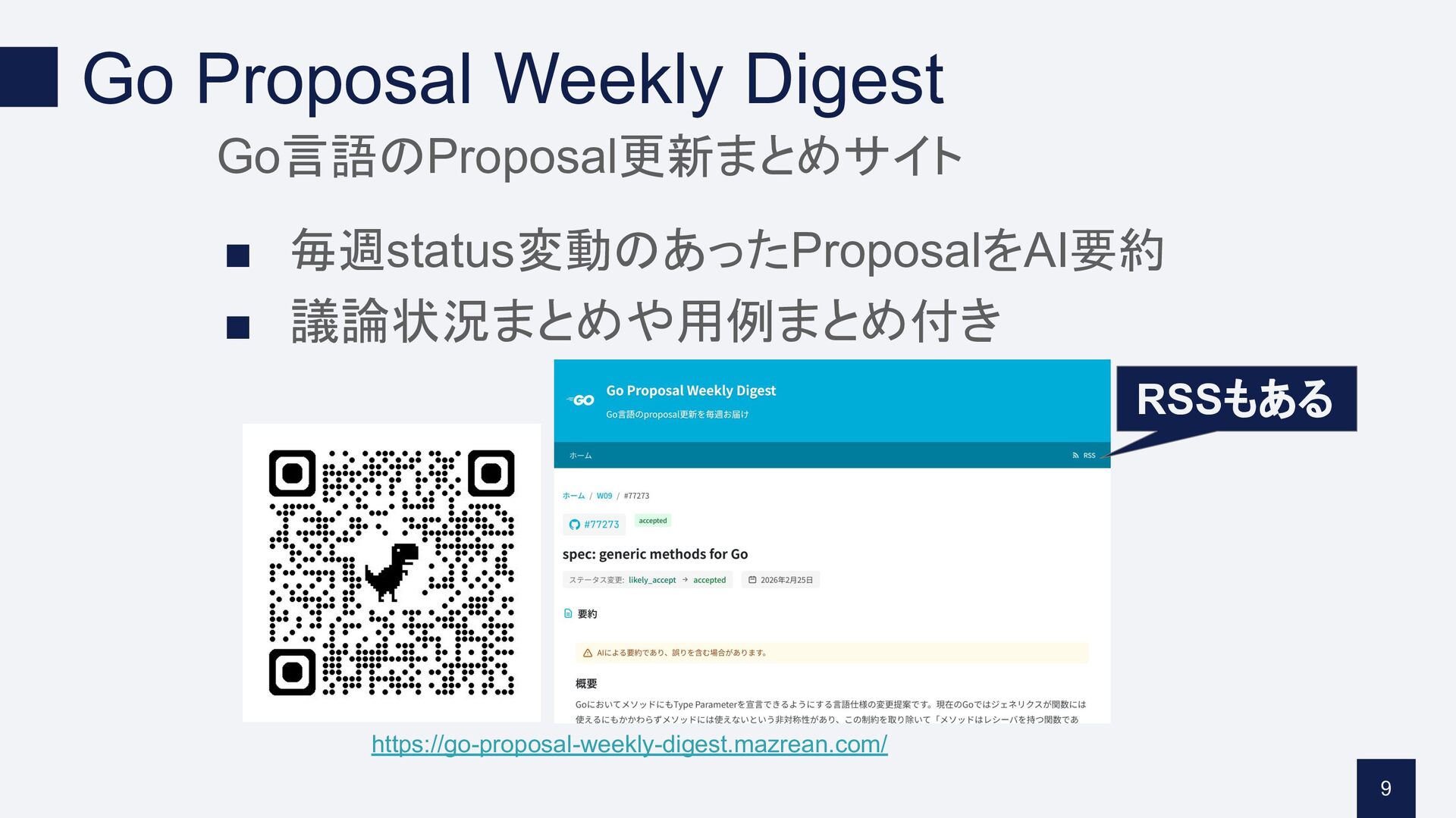 Go Proposal Weekly Digest Go言語のProposal更新まとめサイト ▪ 毎週status変動のあったProposalをAI要約 ▪ 議論状況まとめや用例まとめ付き 9