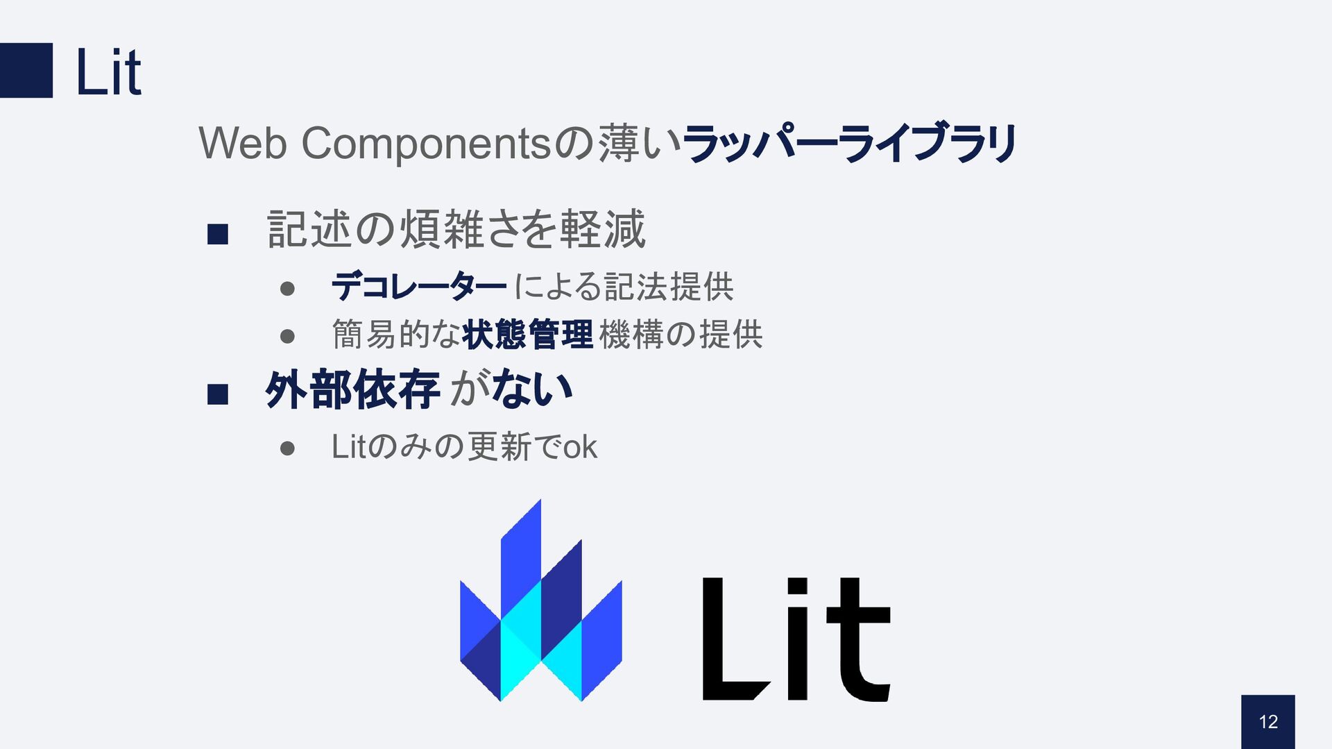 ▪ 外部依存がない • Litのみの更新でok 12