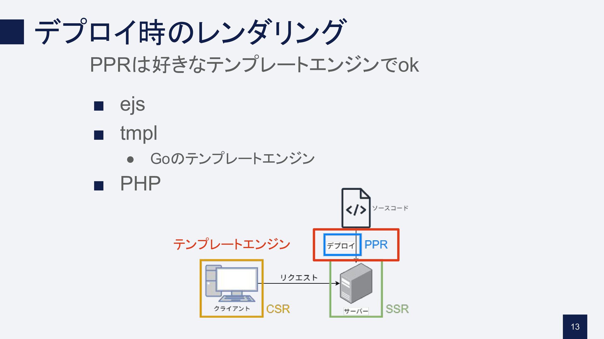 デプロイ時のレンダリング PPRは好きなテンプレートエンジンでok ▪ ejs ▪ tmpl • Goのテンプレートエンジン ▪ PHP