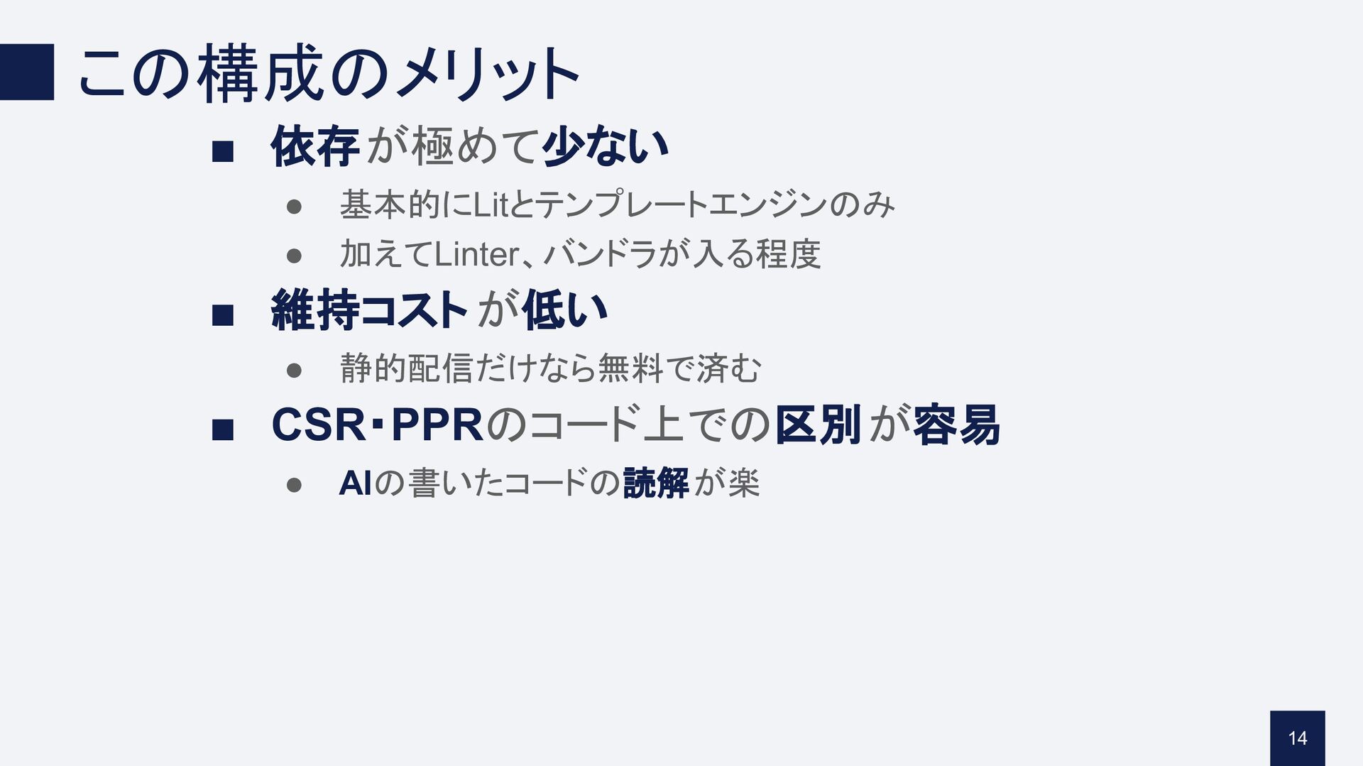 • 静的配信だけなら無料で済む ▪ CSR・PPRのコード上での区別が容易 • AIの書いたコードの読解が楽 14