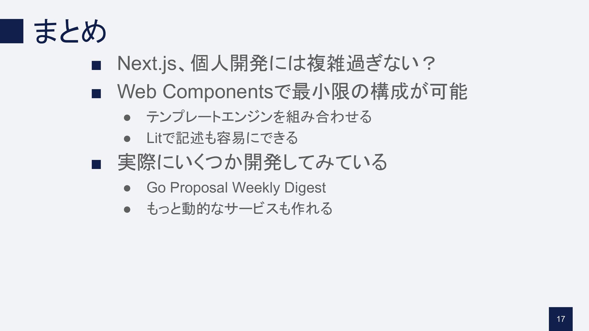まとめ ▪ Next.js、個人開発には複雑過ぎない? ▪ Web Componentsで最小限の構成が可能 • テンプレートエンジンを組み合わせる • Litで記述も容易にできる