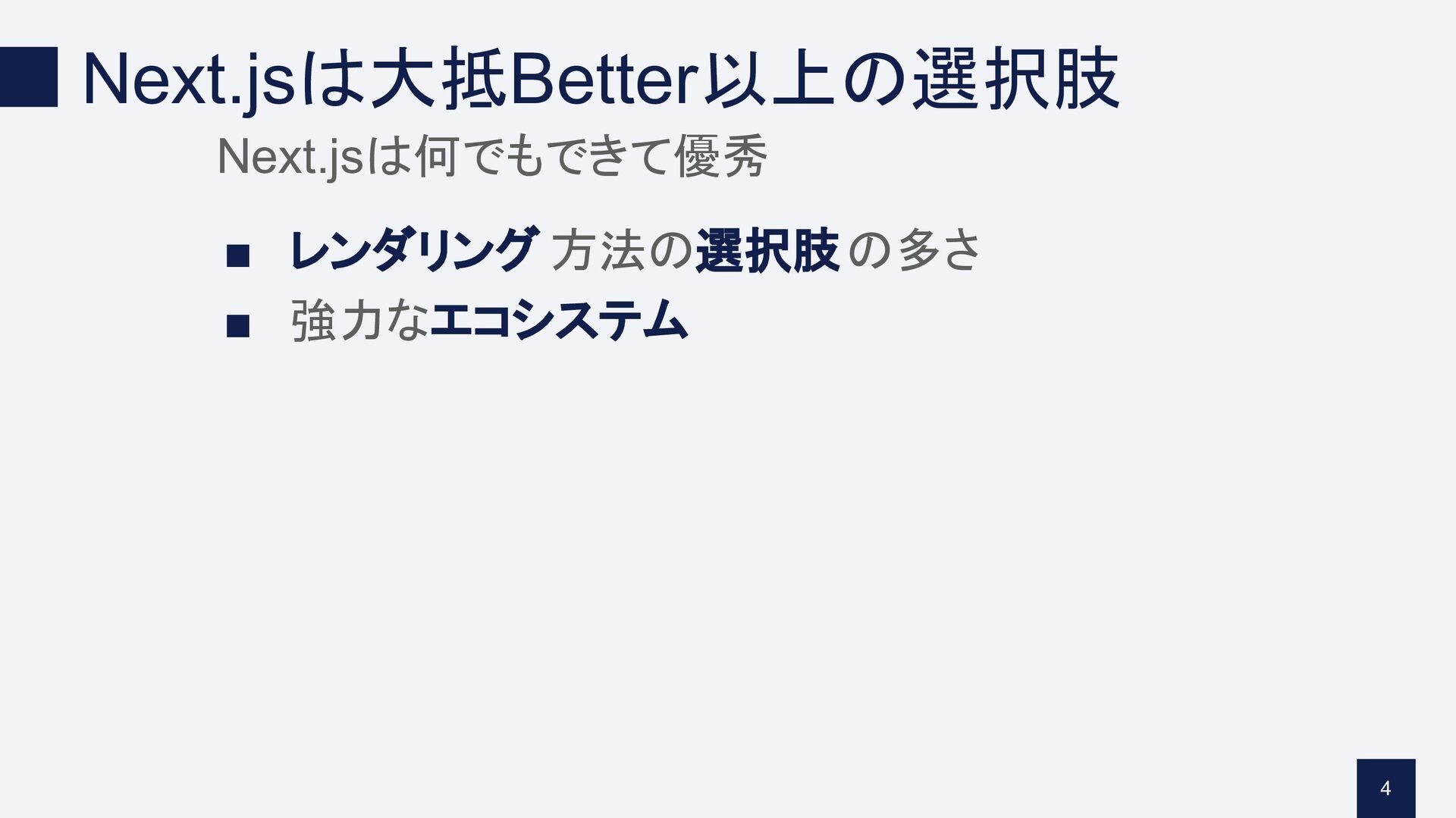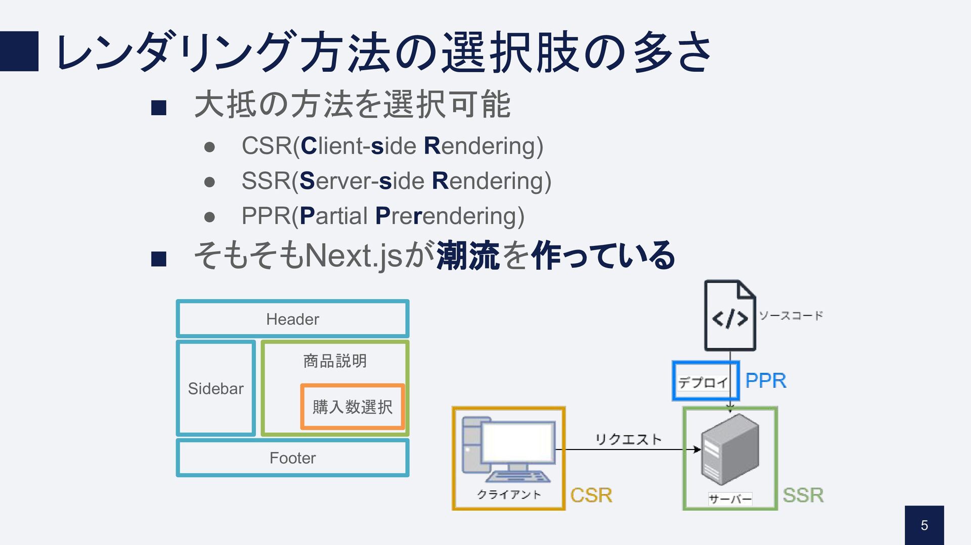 Next.jsは大抵Better以上の選択肢 Next.jsは何でもできて優秀 ▪ レンダリング 方法の選択肢の多さ ▪ 強力なエコシステム 4