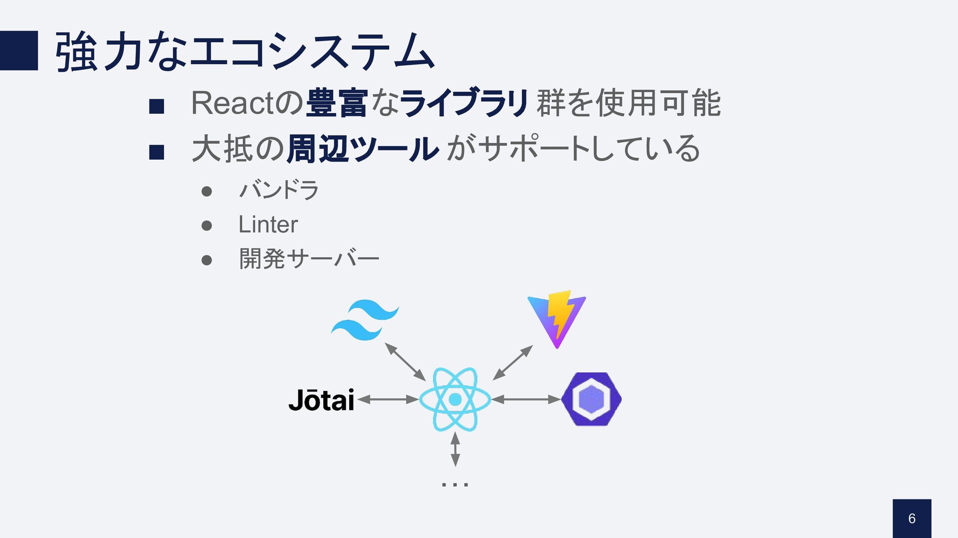 強力なエコシステム ▪ Reactの豊富なライブラリ 群を使用可能 ▪ 大抵の周辺ツール がサポートしている • バンドラ •