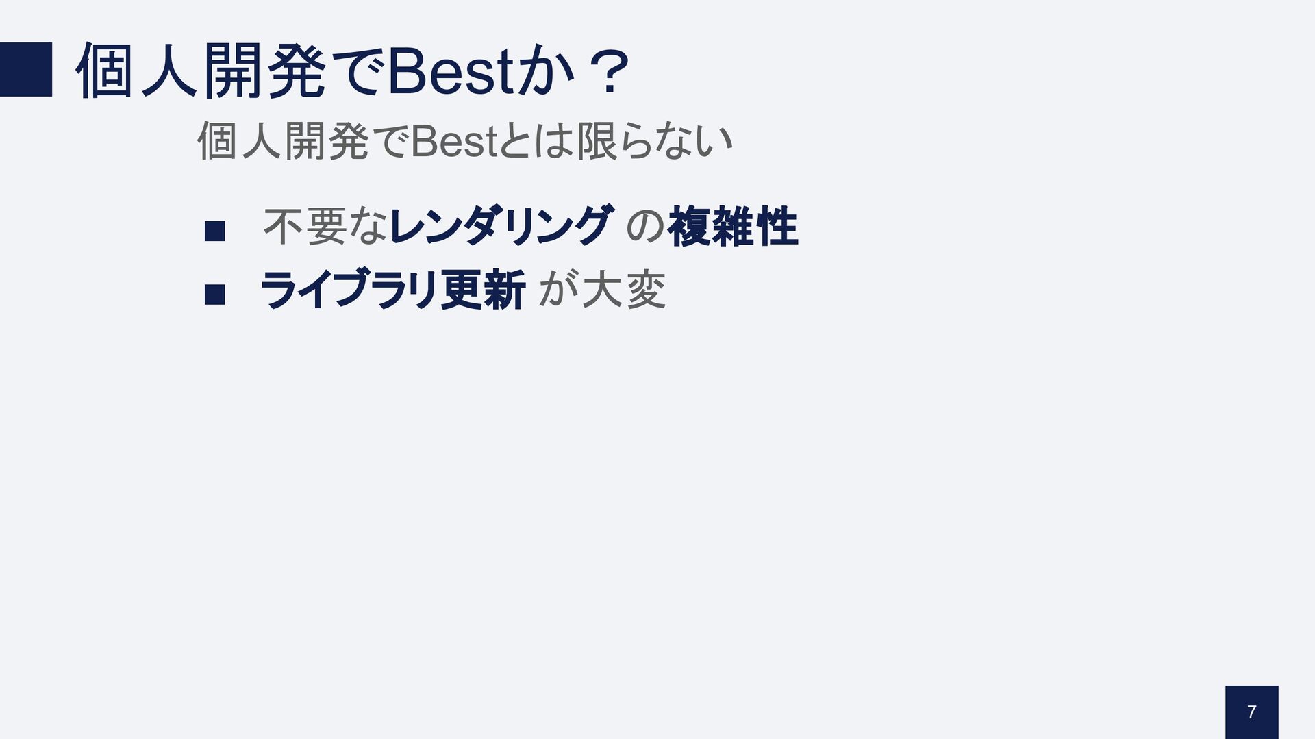 個人開発でBestか? 個人開発でBestとは限らない ▪ 不要なレンダリング の複雑性 ▪ ライブラリ更新 が大変 7