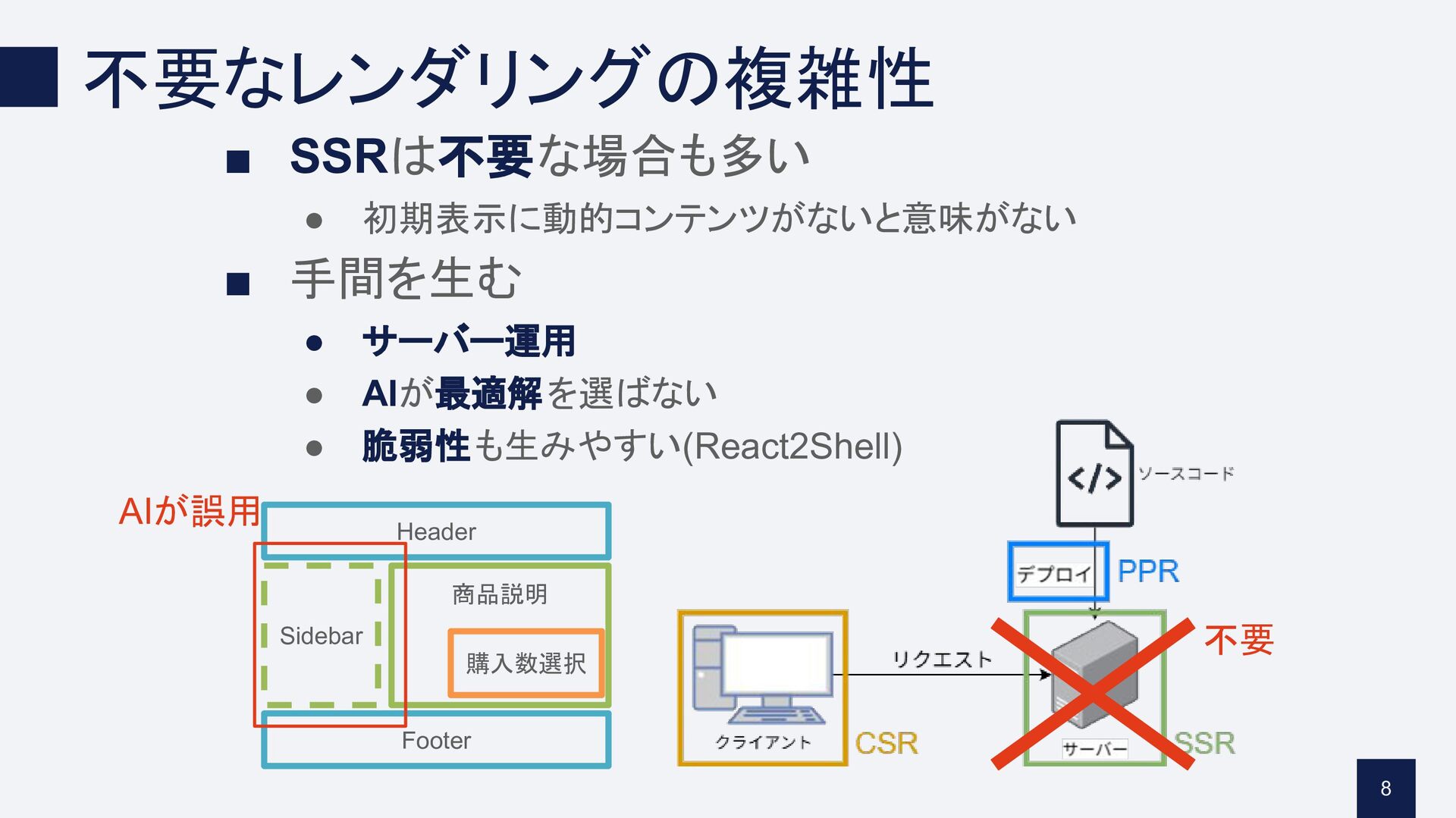 AIが最適解を選ばない • 脆弱性も生みやすい(React2Shell) 8 Header Sidebar Footer 購入数選択 商品説明 不要 AIが誤用