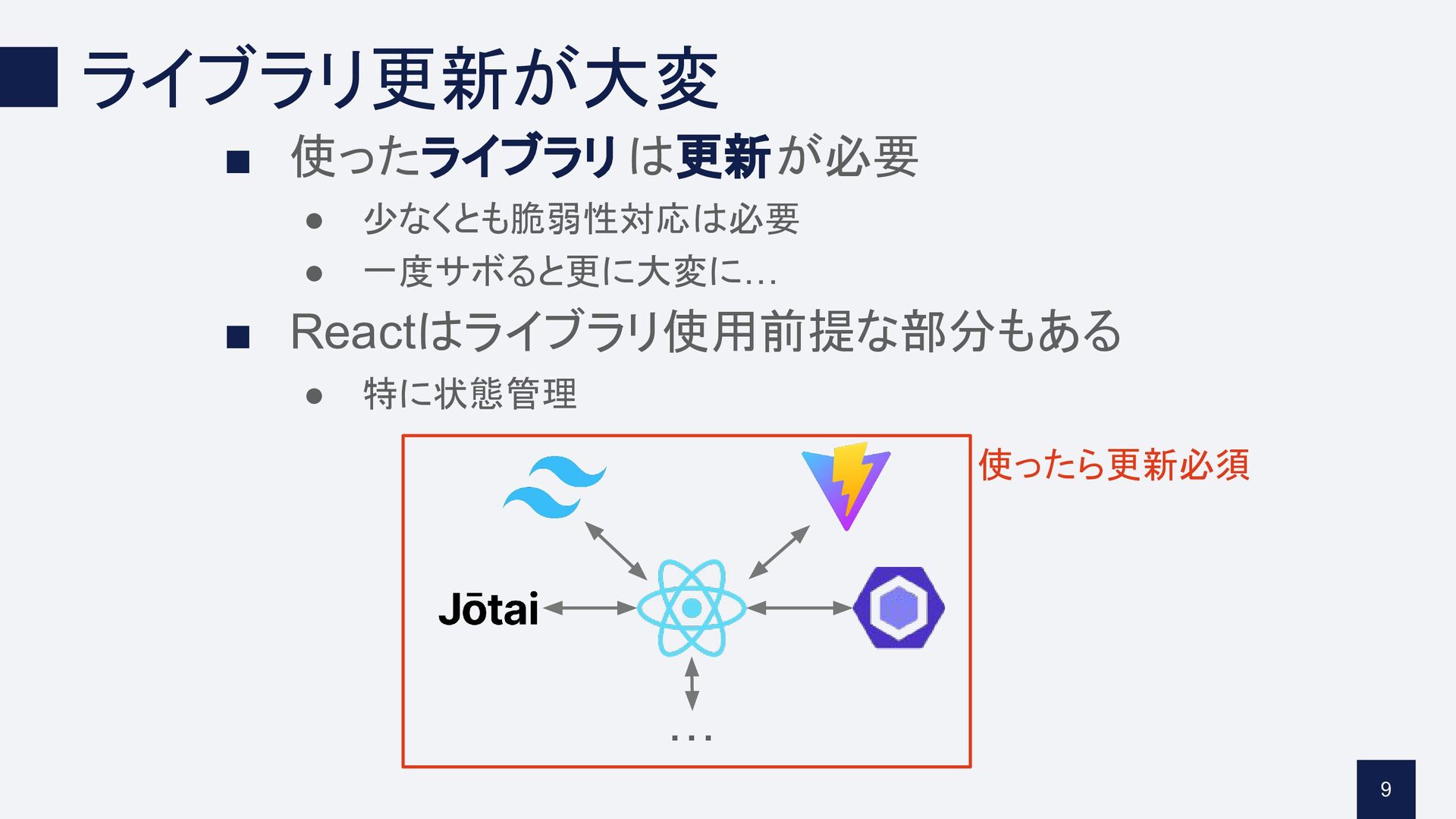 • 特に状態管理 9 … 使ったら更新必須