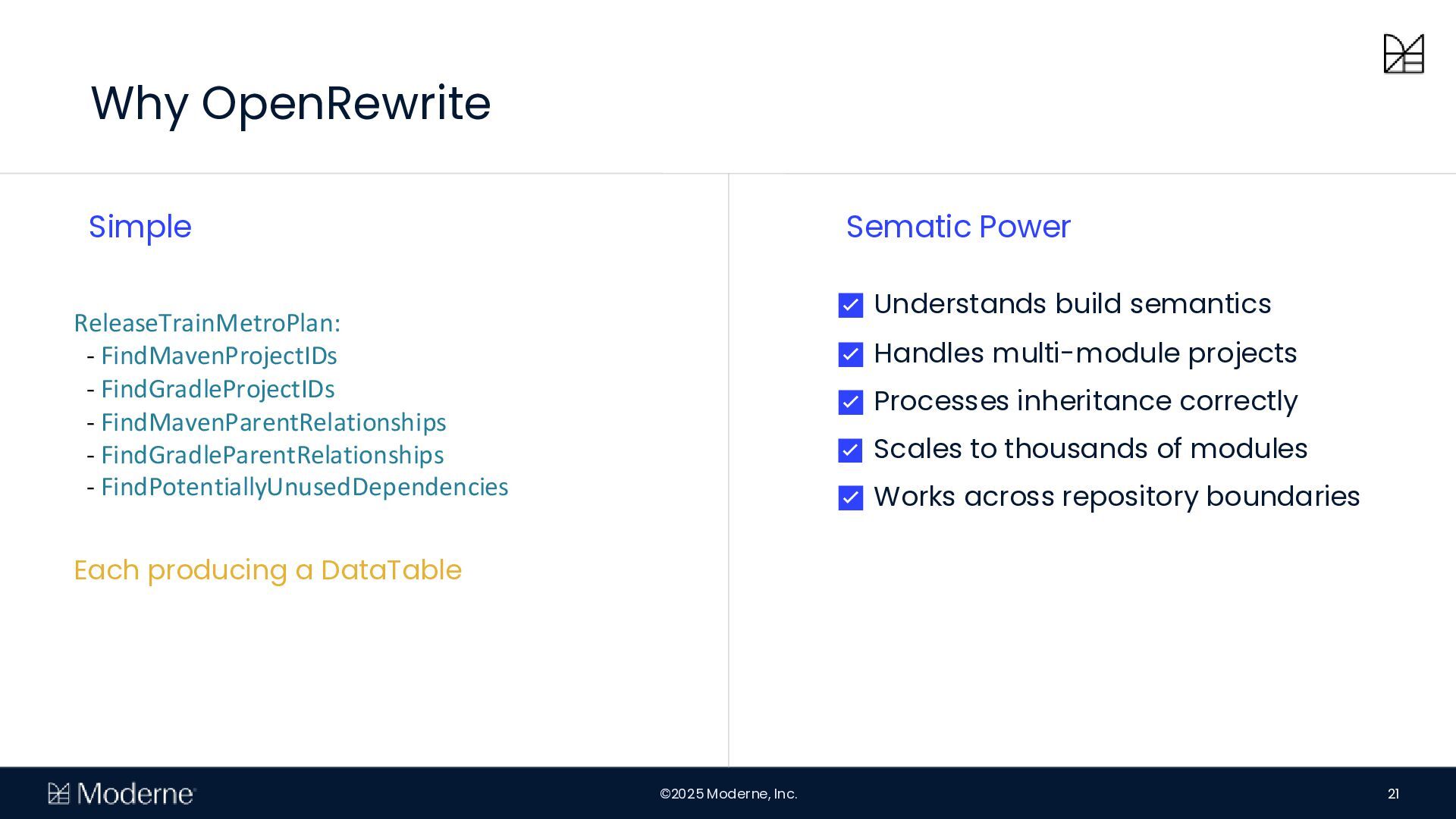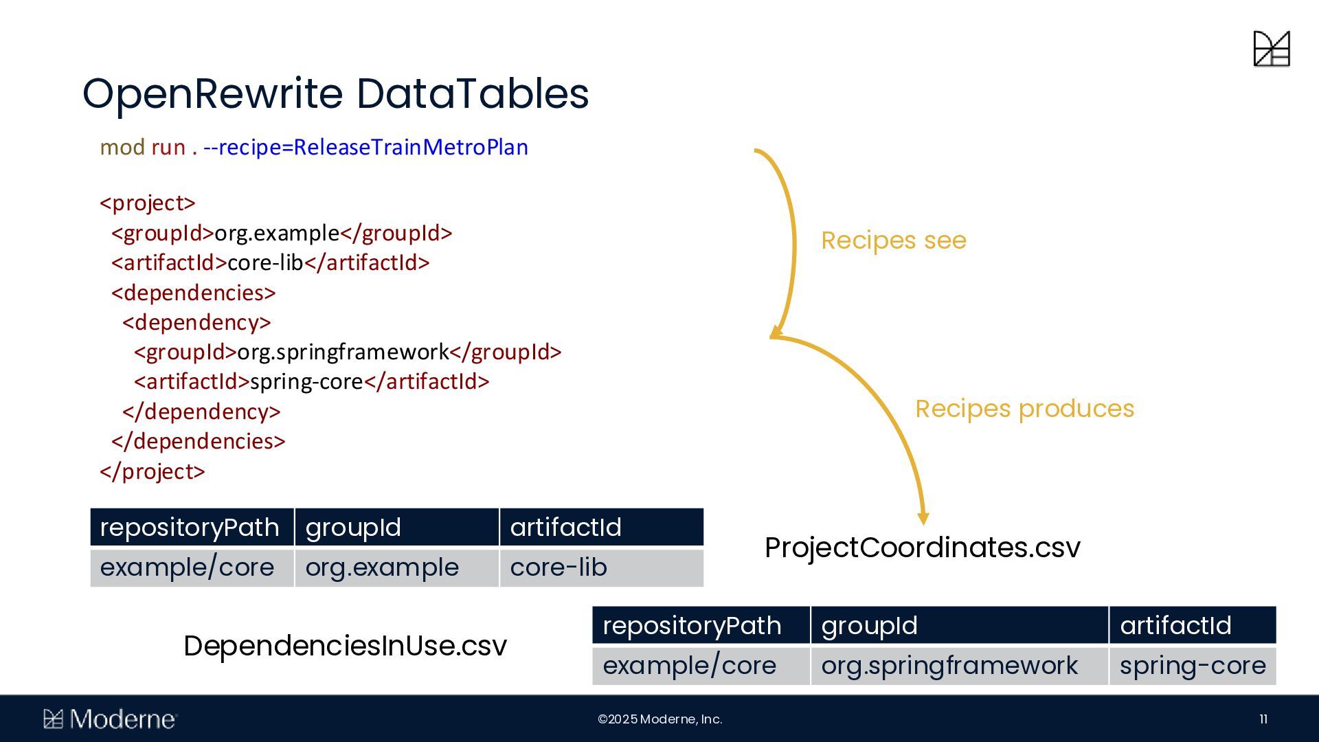 In this session, I will show you how to utilize DataTable and OpenRewrite recipes to query your code base and gain valuable insights into your release planning process. On top of that, I will reveal the underlying Metro plan of your release train so you can plan your releases more easily in even the most complex scenarios.