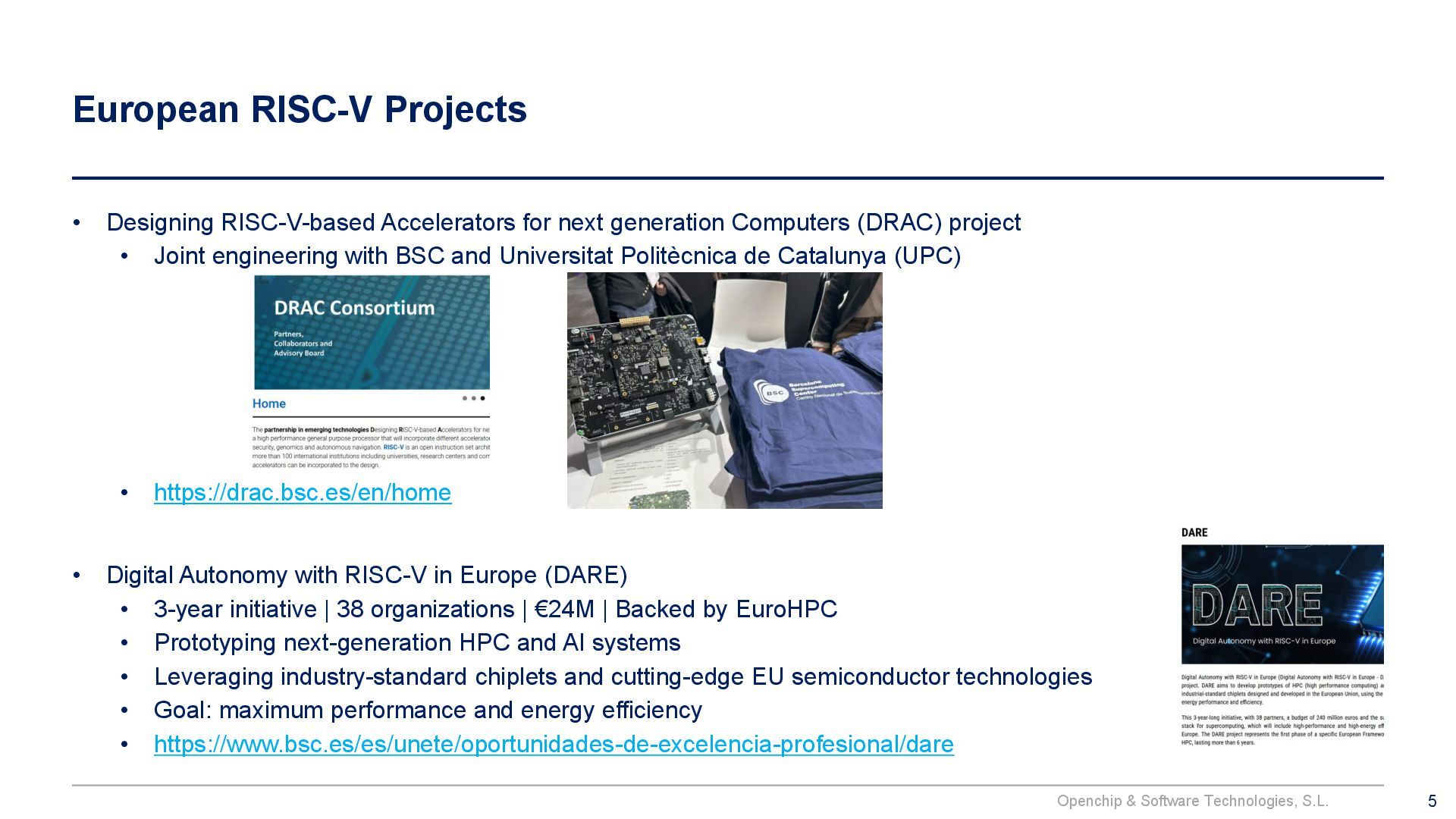 Designing RISC-V-based Accelerators for next generation Computers (DRAC) project • Joint engineering with BSC and Universitat Politècnica de Catalunya (UPC) • https://drac.bsc.es/en/home • Digital Autonomy with RISC-V in Europe (DARE) • 3-year initiative | 38 organizations | €24M | Backed by EuroHPC • Prototyping next-generation HPC and AI systems • Leveraging industry-standard chiplets and cutting-edge EU semiconductor technologies • Goal: maximum performance and energy efficiency • https://www.bsc.es/es/unete/oportunidades-de-excelencia-profesional/dare