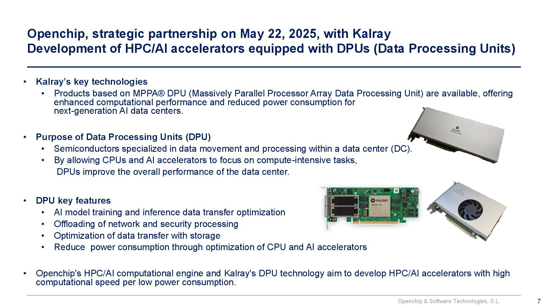 22, 2025, with Kalray Development of HPC/AI accelerators equipped with DPUs (Data Processing Units) 7 • Kalray’s key technologies • Products based on MPPA® DPU (Massively Parallel Processor Array Data Processing Unit) are available, offering enhanced computational performance and reduced power consumption for next-generation AI data centers. • Purpose of Data Processing Units (DPU) • Semiconductors specialized in data movement and processing within a data center (DC). • By allowing CPUs and AI accelerators to focus on compute-intensive tasks, DPUs improve the overall performance of the data center. • DPU key features • AI model training and inference data transfer optimization • Offloading of network and security processing • Optimization of data transfer with storage • Reduce power consumption through optimization of CPU and AI accelerators • Openchip's HPC/AI computational engine and Kalray's DPU technology aim to develop HPC/AI accelerators with high computational speed per low power consumption.