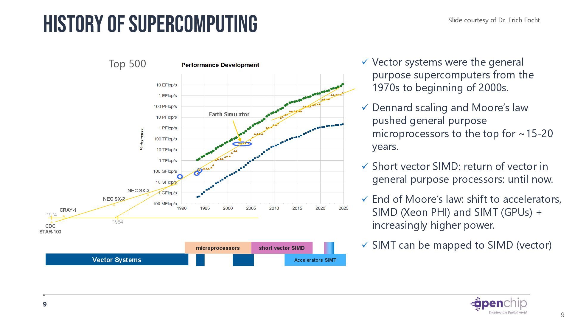 Accelerators SIMT Earth Simulator 1984 1974 CDC STAR-100 CRAY-1 NEC SX-2 NEC SX-3 Vector Systems microprocessors Top 500 ✓ Vector systems were the general purpose supercomputers from the 1970s to beginning of 2000s. ✓ Dennard scaling and Moore‘s law pushed general purpose microprocessors to the top for ~15-20 years. ✓ Short vector SIMD: return of vector in general purpose processors: until now. ✓ End of Moore‘s law: shift to accelerators, SIMD (Xeon PHI) and SIMT (GPUs) + increasingly higher power. ✓ SIMT can be mapped to SIMD (vector) Slide courtesy of Dr. Erich Focht