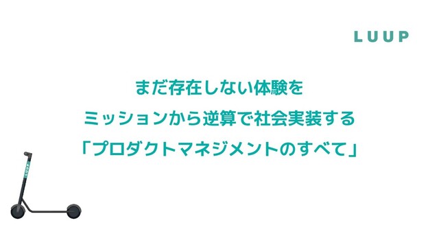 Luup共同創業 → マッキンゼー → 再びLuupにジョイン → CPOに就任 • 担当は、ハードウェアも含むプロダクト全体 の戦略検討・意思決定と組織のマネジメント • ミクシィ、LINE、Tably → 7月からLuup • 担当は、ソフトウェアを中心としたユーザー 体験の構築 • pmconf 運営、プロダクト筋トレ創立