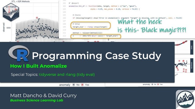 This lesson goes over the fundamentals of rlang and tidy eval so you can program using the same tools I used to make the anomalize. Learn them, and become super powerful for developing tidy-compliant functions!