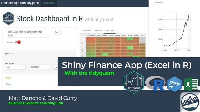 ◦ Drag N’ Drop Pivot Table Interface • Why a Drag N’ Drop Finance App? ◦ Helping to summarize data quickly • Why Tidyquant 1.0.0? ◦ Brief history ◦ Why am I bringing Excel to R??? • 30-Min Demo ◦ Tidyquant API ◦ VLOOKUP in R ◦ Pivot Table in R ◦ Summarizing by Time ◦ NEW Excel Functions ◦ Shiny Drag N’ Drop Finance App [LL PRO] • Pro-Tips & Learning Guide