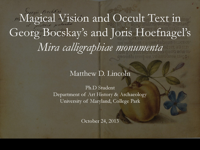 The "Mira calligraphiae monumenta is one of the most intriguing objects of the kusntkammer of Rudolf II. The creators of this layered work never met each other; Georg Bocskay, secretary for Ferdinand I, penned the manuscript’s calligraphic displays in 1561-2, while Joris Hoefnagel was commissioned by Rudolf three decades later to illuminate this treasure with brilliantly rendered flora and fauna. It has been argued that Hoefnagel’s additions establish a paragone between the painted image and the written word, his illusionistic naturalia surpassing Bocskay’s page-bound artificialia. It has been further argued that the outcome of this paragone reflects a Paracelsian philosophy shared by the Rudolfine court: that true knowledge can only come from natural investigation and not from secondary texts. However, this interpretation elides the complexities of magical and occult studies in Prague. The diverse schools of occult thought entertained at the Rudolfine court also included that of Heinrich Cornelius Agrippa, who believed inscribed signs had the capacity to become sigils endowed with power over the natural world. I argue that the complex formal interplay of text and image on certain pages of the MCM at times suggests that Bocskay’s scripts indeed hold sway over Hoefnagel’s natural objects. This suggests that even as Rudolf and his court appreciated the MCM for its aesthetic beauty and inventiveness, these semiotically-intelligent readers must also have related its formally-cohesive tableaus of text and nature to sixteenth-century occult notions of the physical power of the inscribed sign investigated in their own court.