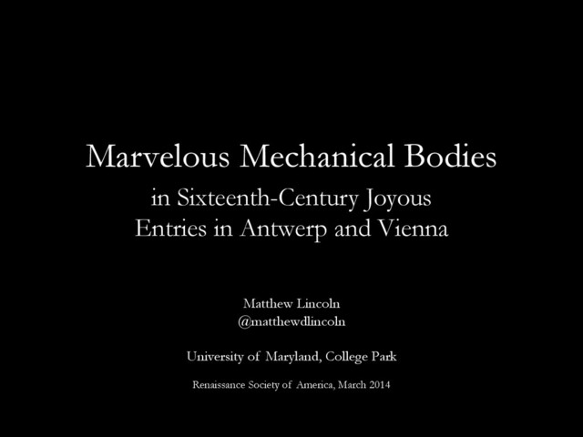 This paper explores the mechanized performance of fealty by marvelous mechanical bodies in early modern joyous entries in northern Europe. Colossal sculptures and paintings allegedly bowed to Philip II in 1549 and Duke François of Anjou in 1582 during their entries into Antwerp, and to Rudolf II in his 1577 entry into Vienna. I will investigate how these automated bodies meshed with the discourses of these spectacular entries. Contemporary theories of meraviglia suggest a body that conspicuously crossed the boundary between inert sculpture and animated being could still the audience into statuesque spectators, thus calling attention to the wondrousness of the machine’s manufacture as well as the wondrousness of the animating sovereign’s presence. By connecting these mechanical marvels to literary conventions of artificial bodies and automata in late sixteenth-century elite society, we can better understand why these fealty-performing bodies would have been considered ideal signals of courtly power.