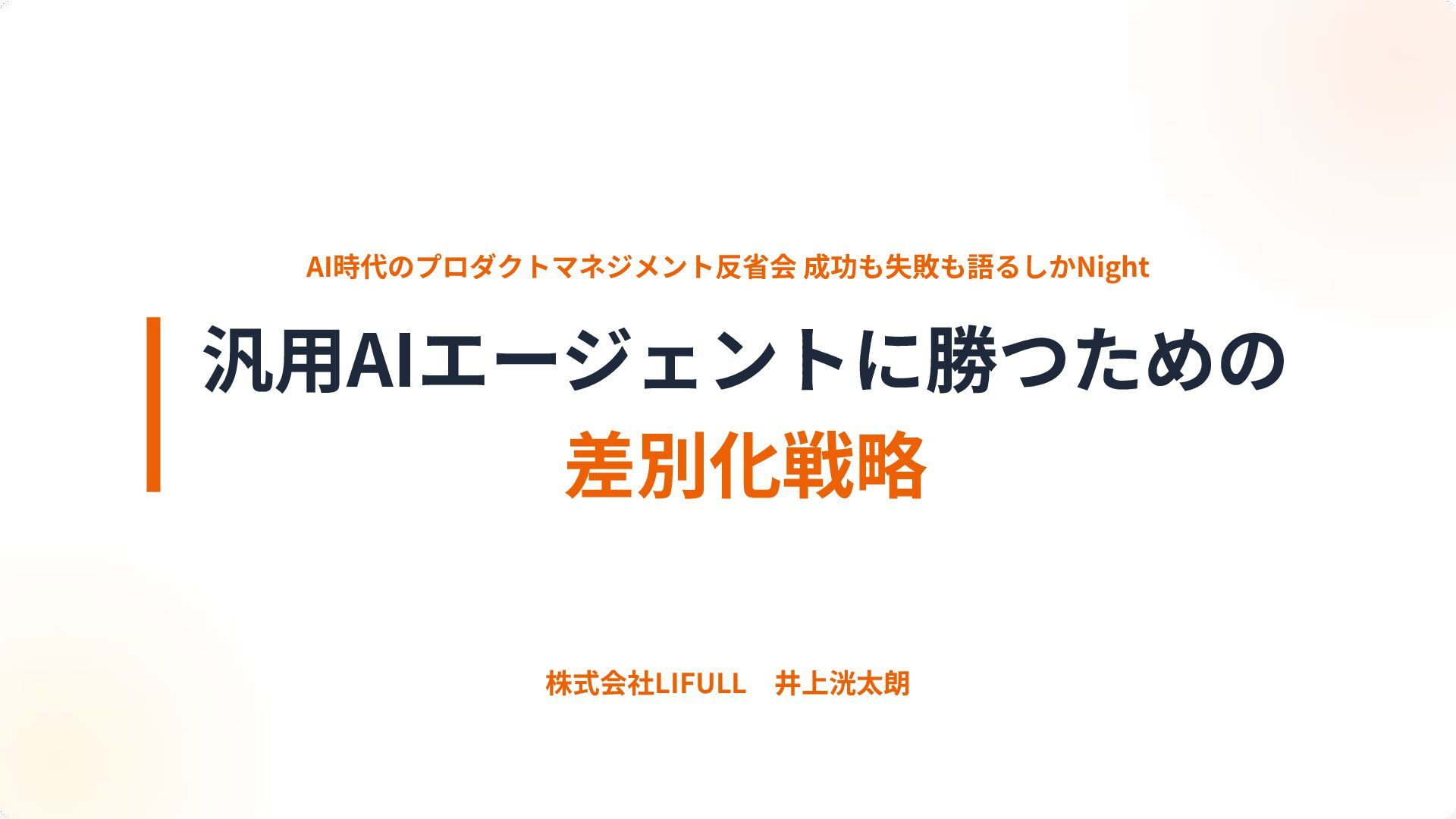 AI時代のプロダクトマネジメント反省会 成功も失敗も語るしかNight 汎⽤AIエージェントに勝つための 差別化戦略 株式会社LIFULL 井上洸太朗