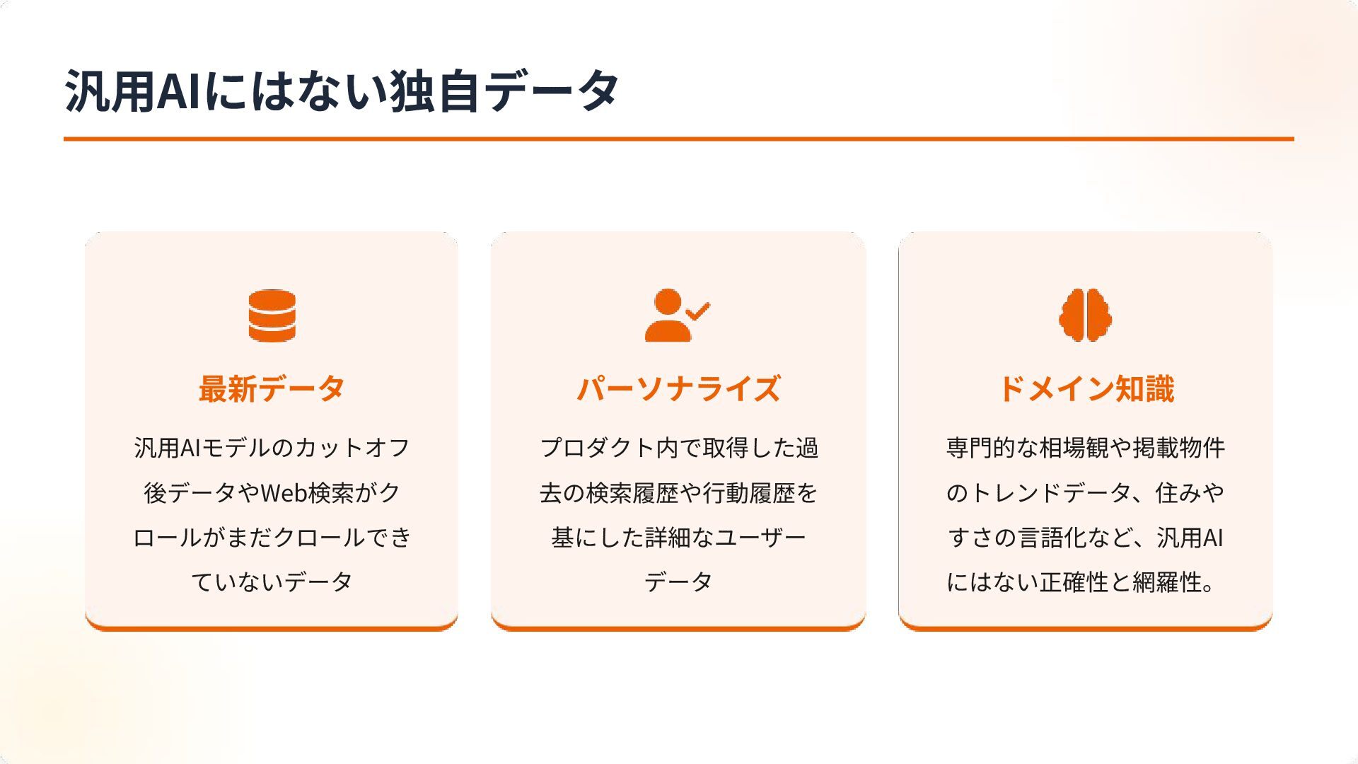 データ ドメイン知識 専⾨的な相場観や掲載物件 のトレンドデータ、住みや すさの⾔語化など、汎⽤AI にはない正確性と網羅性。