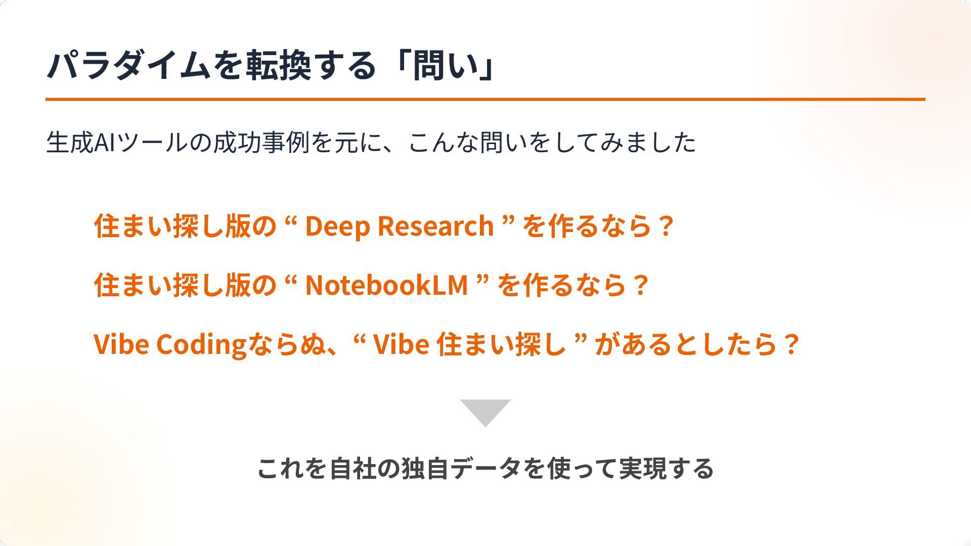 ⽣成AIツールの成功事例を元に、こんな問いをしてみました 住まい探し版の “ Deep Research ” を作るなら? パラダイムを転換する「問い」 住まい探し版の “