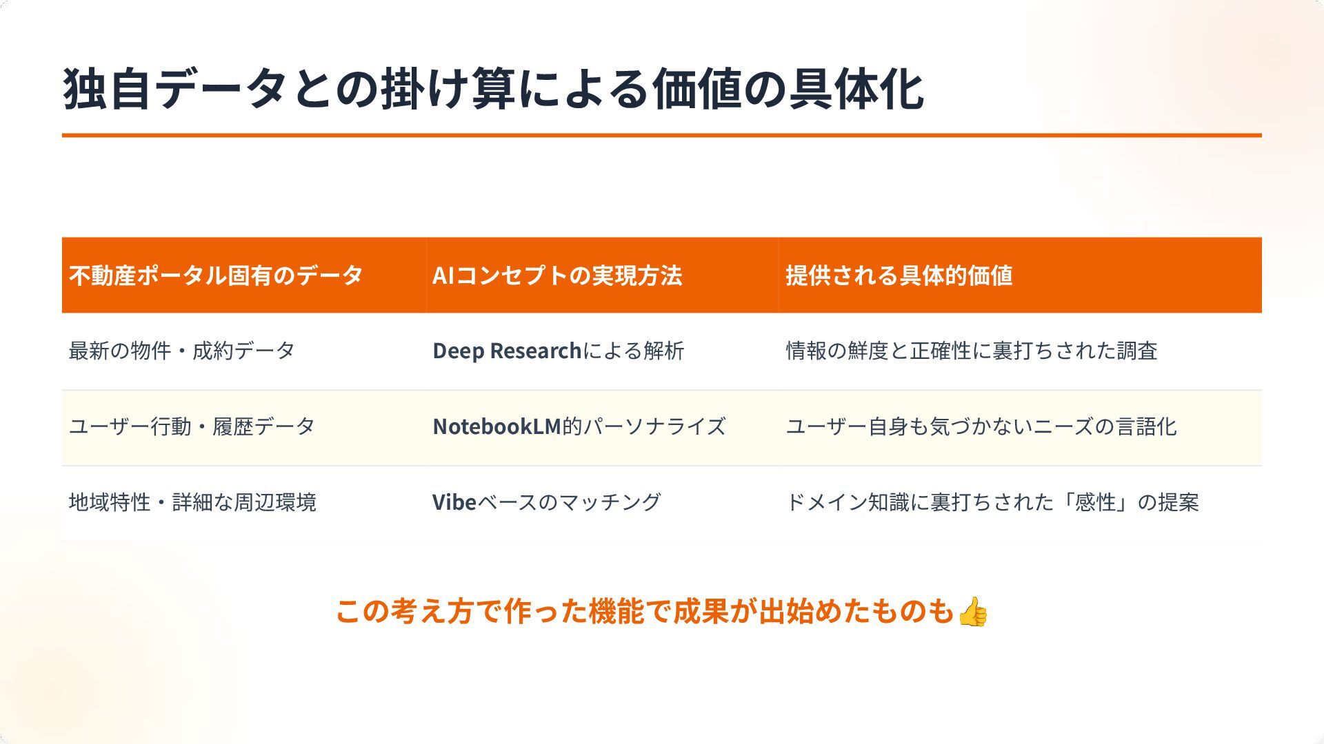 地域特性‧詳細な周辺環境 Vibeベースのマッチング ドメイン知識に裏打ちされた「感性」の提案 この考え⽅で作った機能で成果が出始めたものも👍 独⾃データとの掛け算による価値の具体化