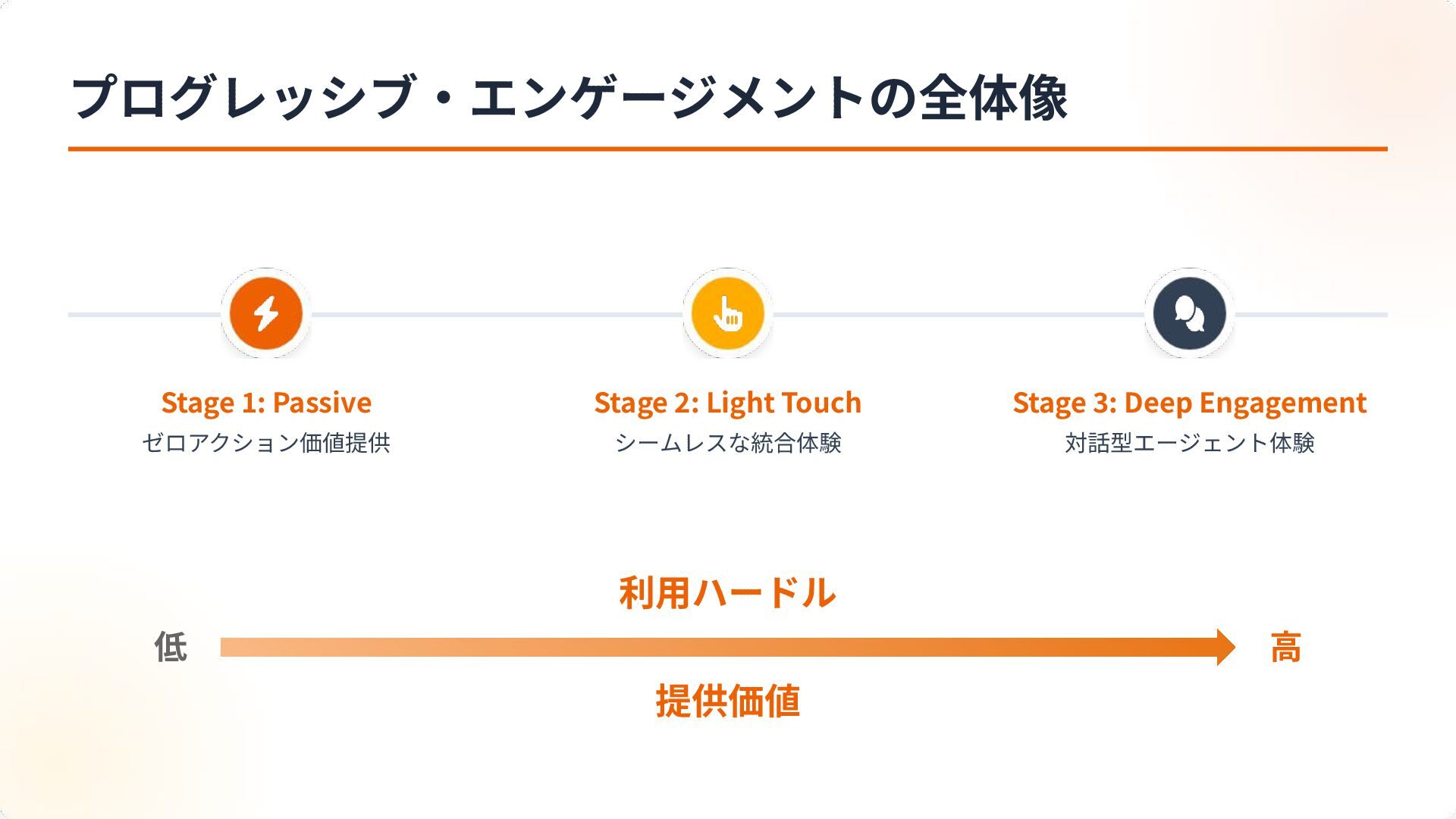 Stage 1: Passive ゼロアクション価値提供 Stage 2: Light Touch シームレスな統合体験 Stage