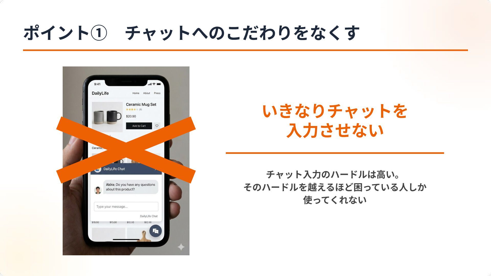 ポイント① チャットへのこだわりをなくす いきなりチャットを ⼊⼒させない チャット⼊⼒のハードルは⾼い。 そのハードルを越えるほど困っている⼈しか 使ってくれない