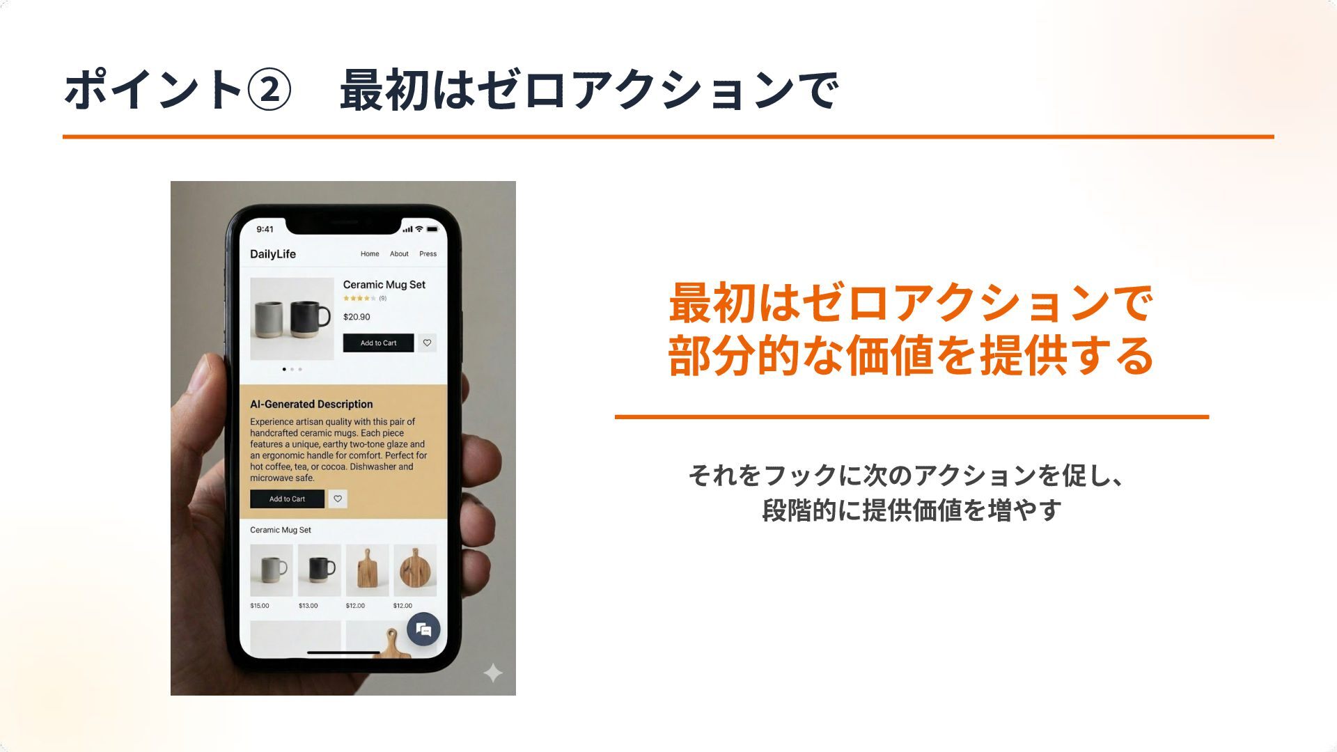 ポイント② 最初はゼロアクションで 最初はゼロアクションで 部分的な価値を提供する それをフックに次のアクションを促し、 段階的に提供価値を増やす