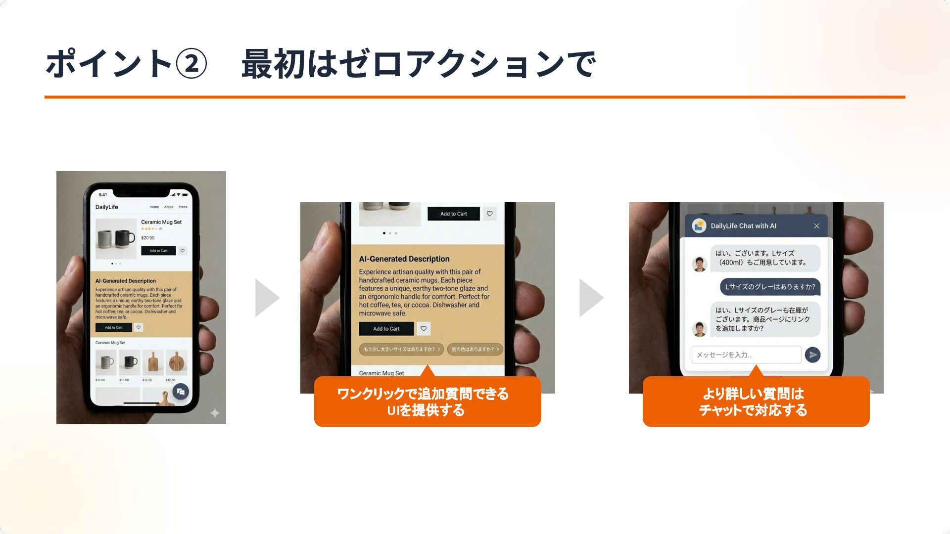 ポイント② 最初はゼロアクションで ワンクリックで追加質問できる UIを提供する より詳しい質問は チャットで対応する